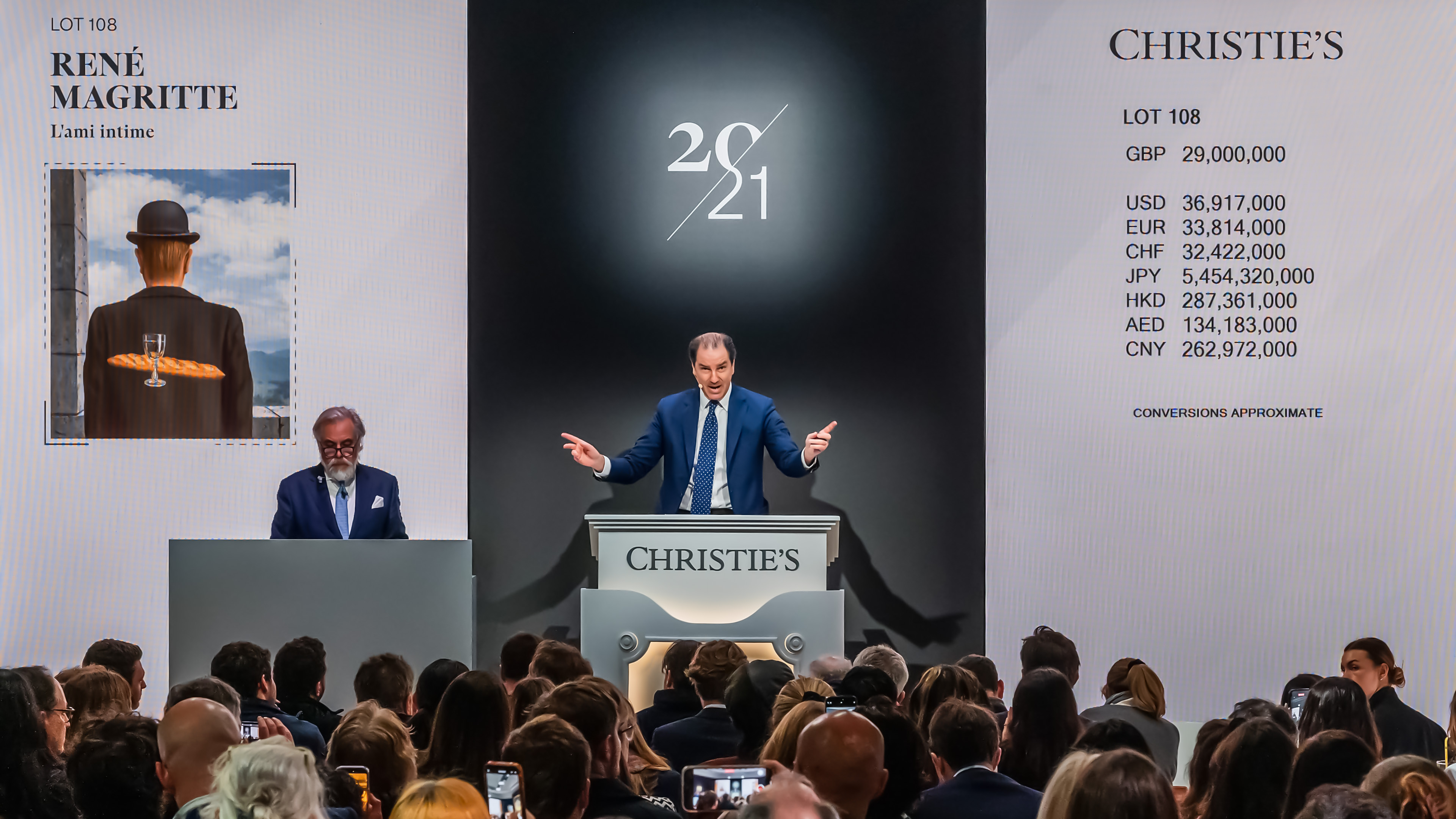 Co-Chairman of Impressionist and Modern Art, Adrien Meyer, at the rostrum with René Magritte’s L’ami intime (The Intimate Friend), 1958. The work sold for £33,660,000 on 7 March 2024 at Christie’s in London