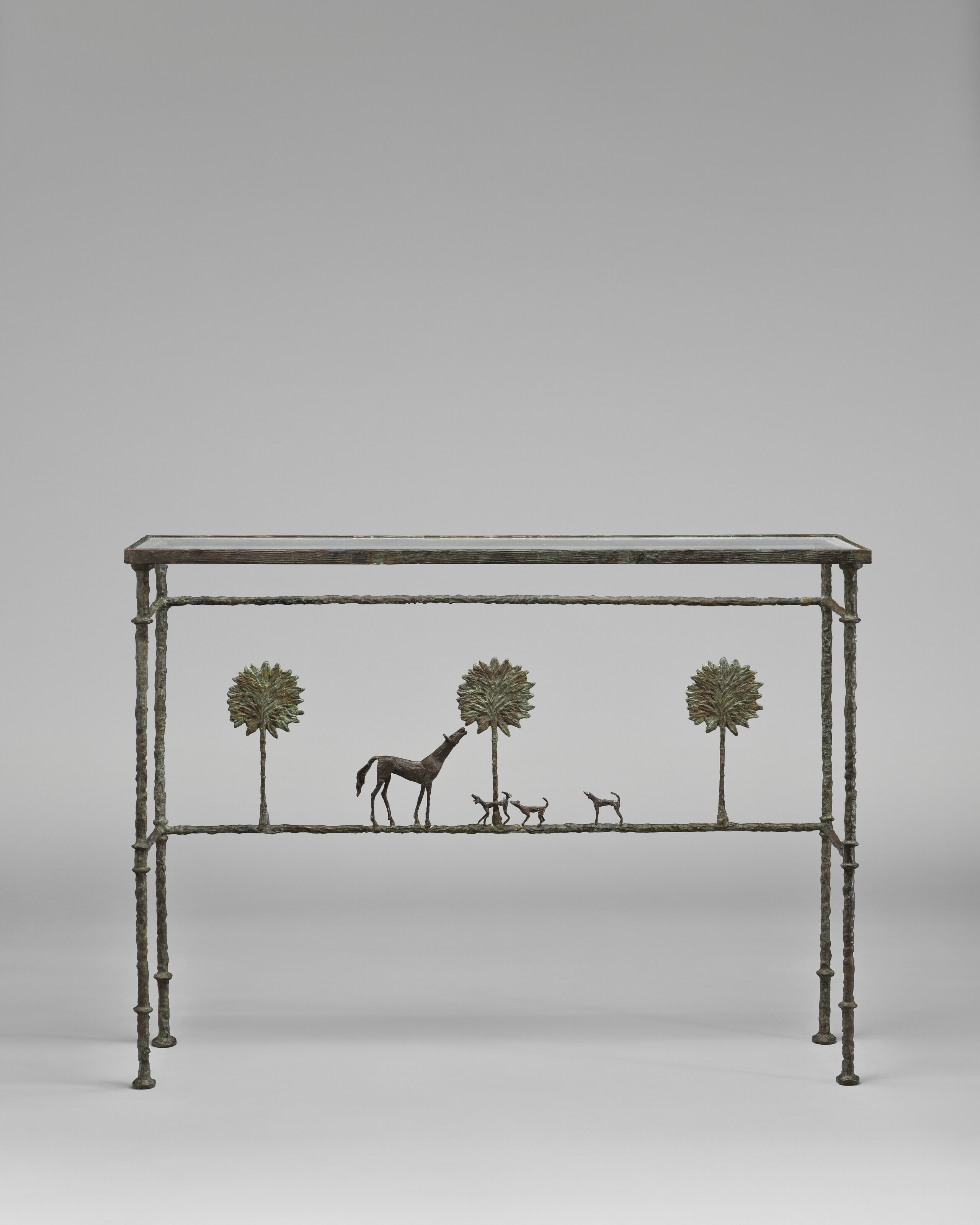 Diego Giacometti (1902-1985), ‘Promenade des amis’ Console, designed circa 1977. Patinated bronze, glass. 35⅝ x 48 x 13⅜ in (90.5 x 122 x 34 cm). Sold for $3,979,000 in 21st Century Evening Sale Featuring Works from the Edlis | Neeson Collection on 19 November 2025 at Christie’s in New York