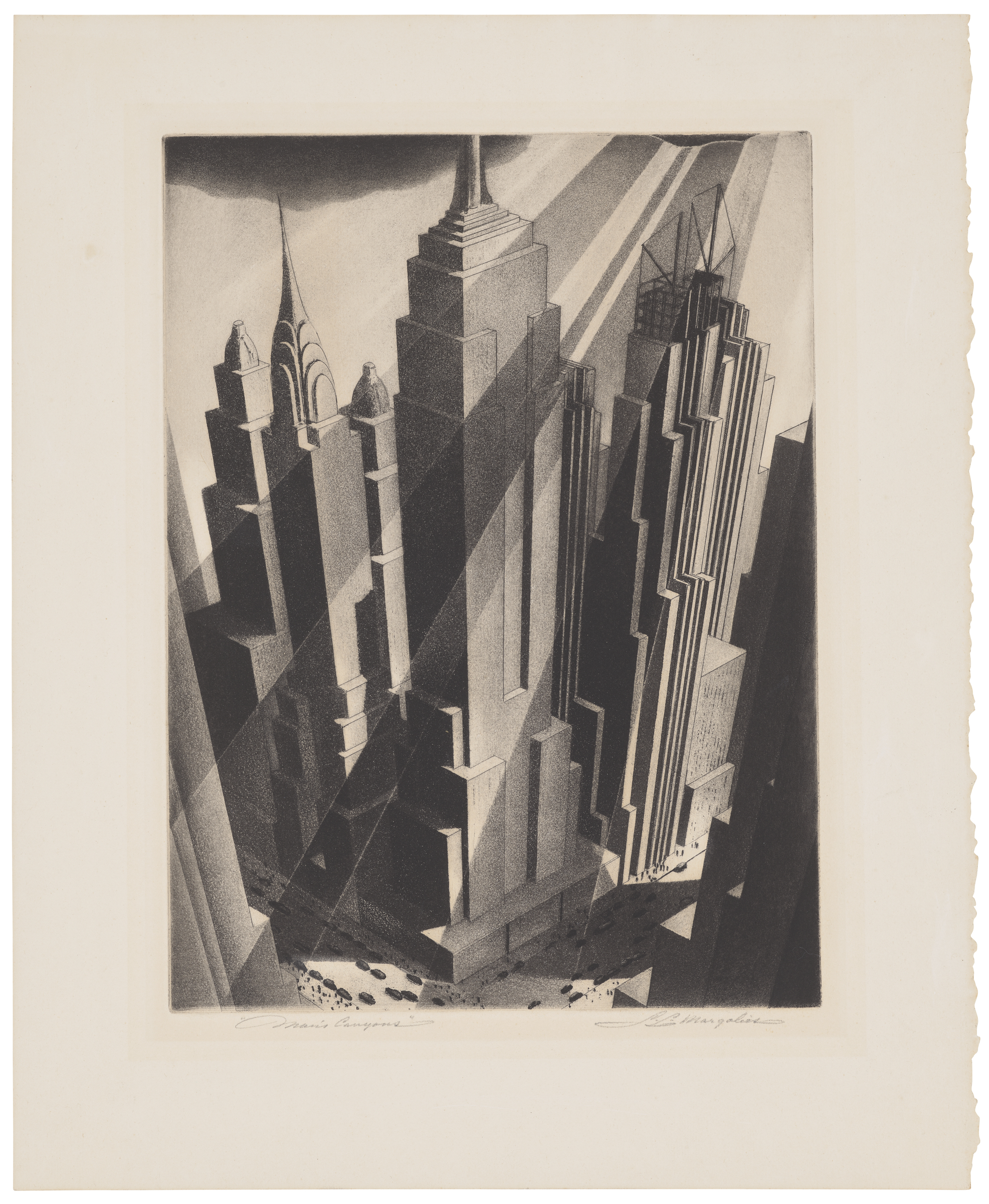 Samuel Margolies (1897-1974), Man's Canyons, 1936. Etching with aquatint, on laid paper. Image: 11⅞ x 8¾ in (302 x 222 mm). Sheet: 15⅞ x 13 in (403 x 330 mm). Estimate: $5,000-7,000. Offered in Prints & Multiples on 14-15 April 2026 at Christie’s in New York