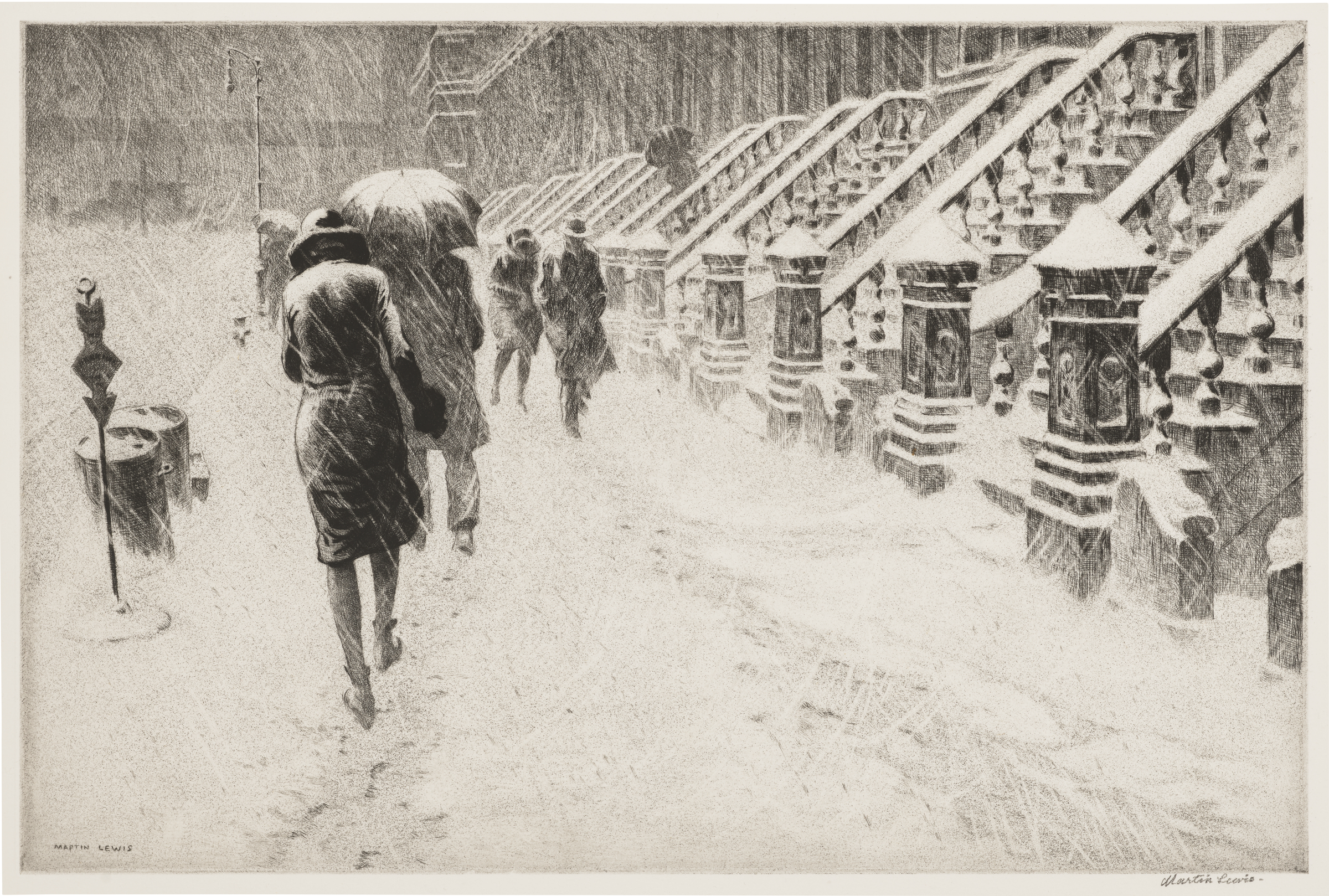 Martin Lewis (1881-1962), Stoops in the Snow, 1930. Drypoint and sand ground, on J. Whatman paper. Image: 9⅞ x 15 in (251 x 381 mm). Sheet: 13⅝ x 18½ in (346 x 470 mm). Estimate: $10,000-15,000. Offered in Prints & Multiples on 14-15 April 2026 at Christie’s in New York