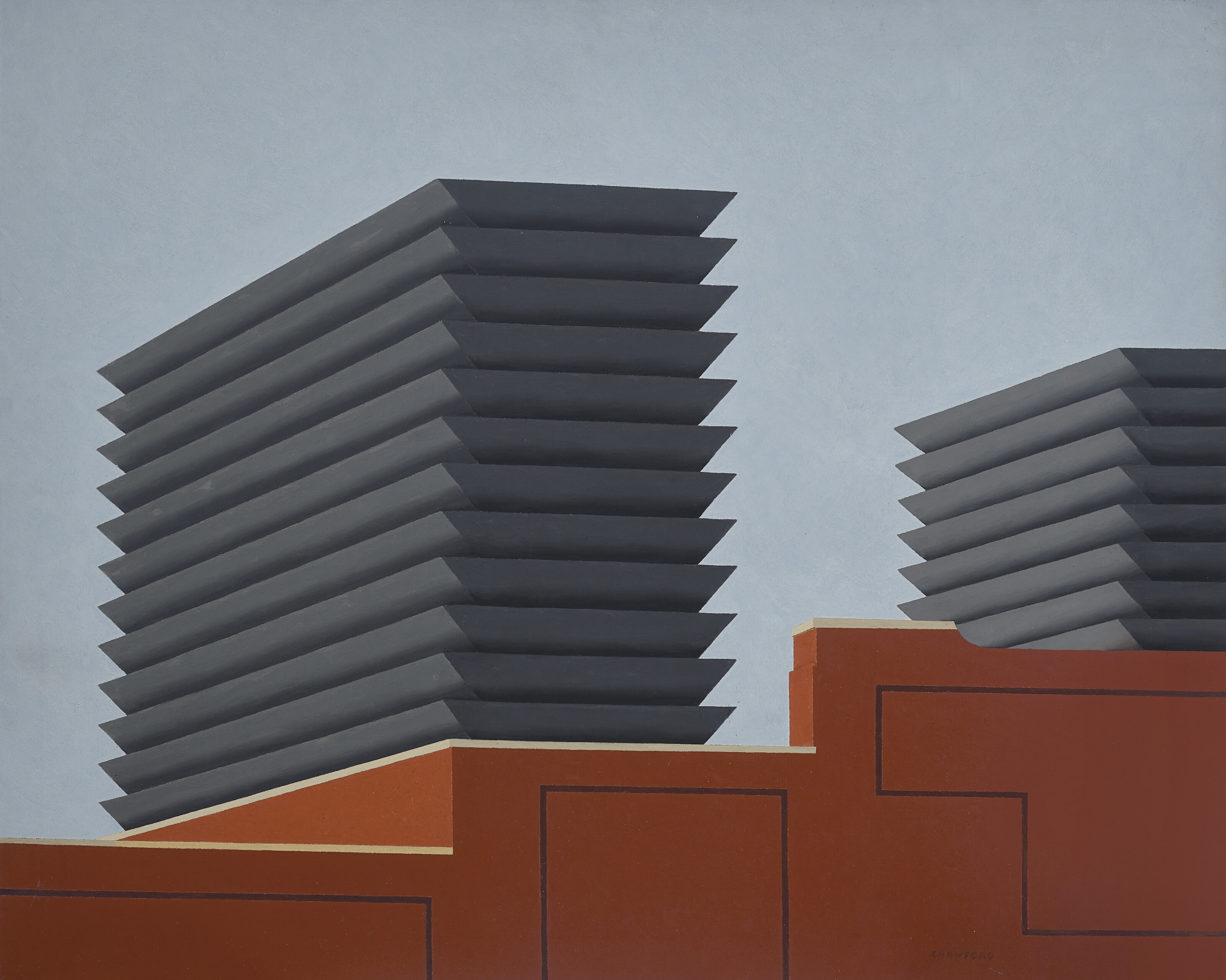The Precisionists were not an organised movement but a group of like-minded individuals who sought to depict, through soft, precise brushwork, the sleek lines and flat, hard-edged forms of the new industrial landscape. Among them were the painters Charles Sheeler, Ralston Crawford, Charles Demuth, George Ault, Joseph Stella, Elsie Driggs and Morton Schamberg. These painters echoed the anonymity of the city by hiding their personalities from the viewer. They created a new form of art that was cool, detached and powerfully atmospheric. While primarily associated with urban imagery, Precisionist artists would also apply the same minimal approach to still-lifes or rural landscapes and interiors.