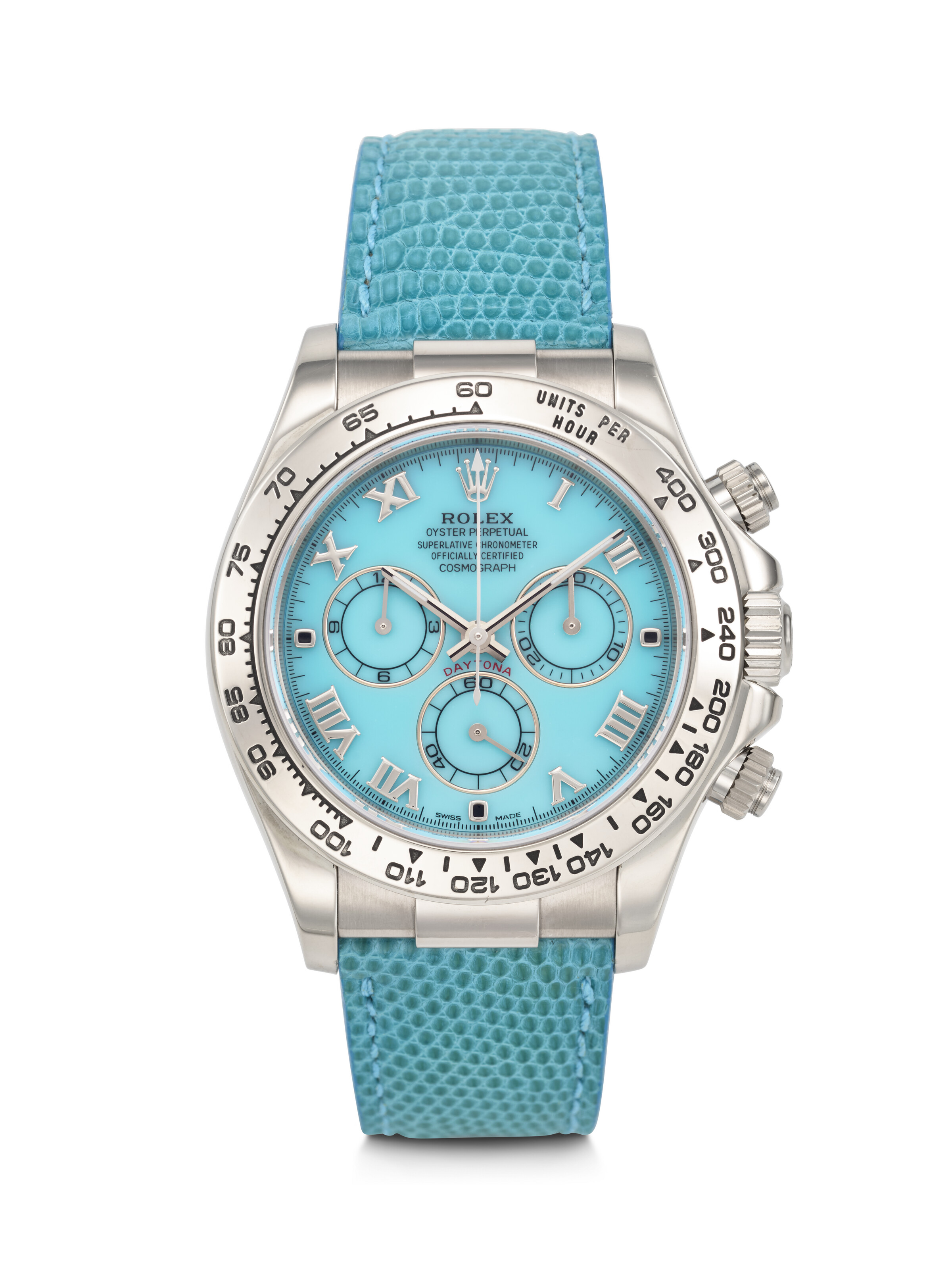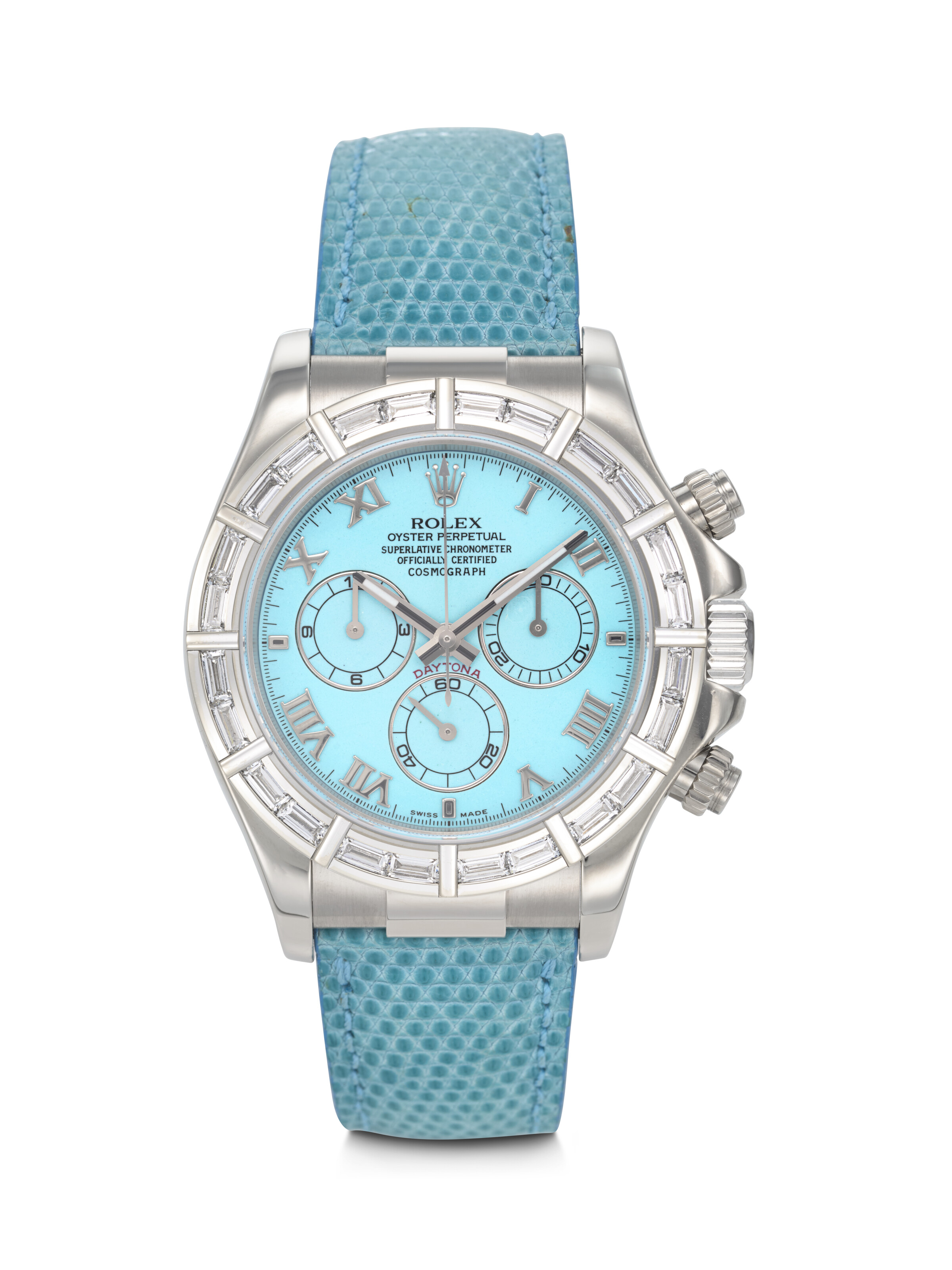Rolex. An extremely rare, vibrant and attractive 18k white gold and baguette diamond-set automatic chronograph wristwatch with light blue turquoise dial Daytona 'Beach' turquoise model, ref. 116589, case no. K576250, c. 2001. Estimate: $150,000-250,000. Offered in Important Watches on 9 December 2025 at Christie’s in New York