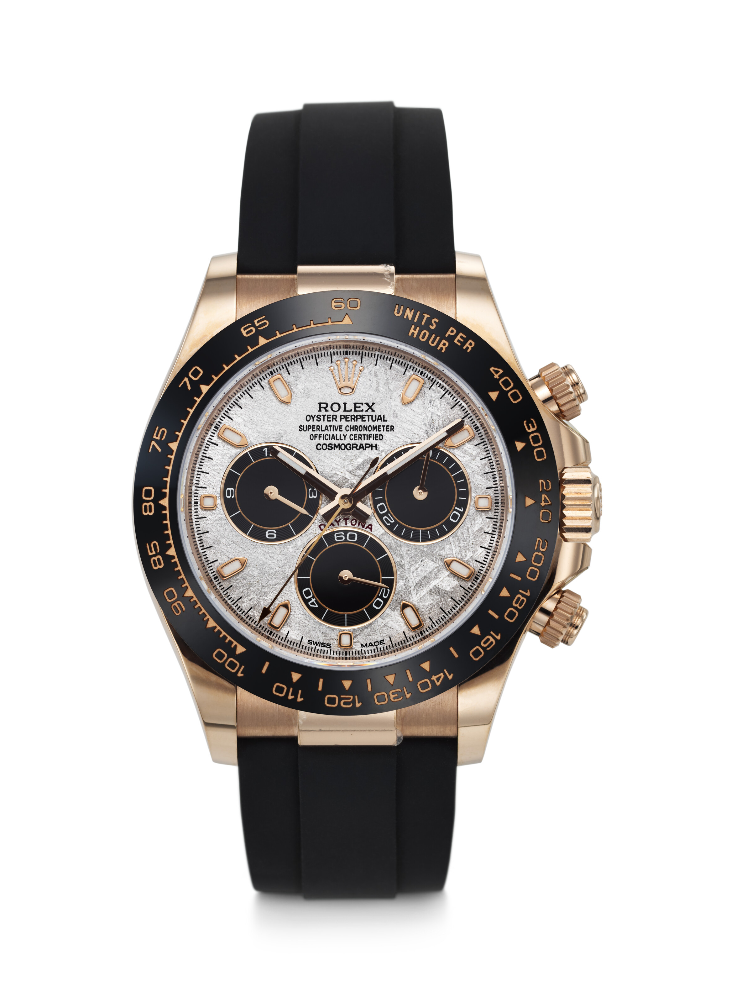 Rolex. A sporty and rare 18k pink gold and ceramic automatic chronograph wristwatch with meteorite dial Daytona meteorite model, ref. 116515ln, case no. 71j25415, c. 2023. Estimate: $40,000-80,000. Offered in Important Watches on 9 December 2025 at Christie’s in New York