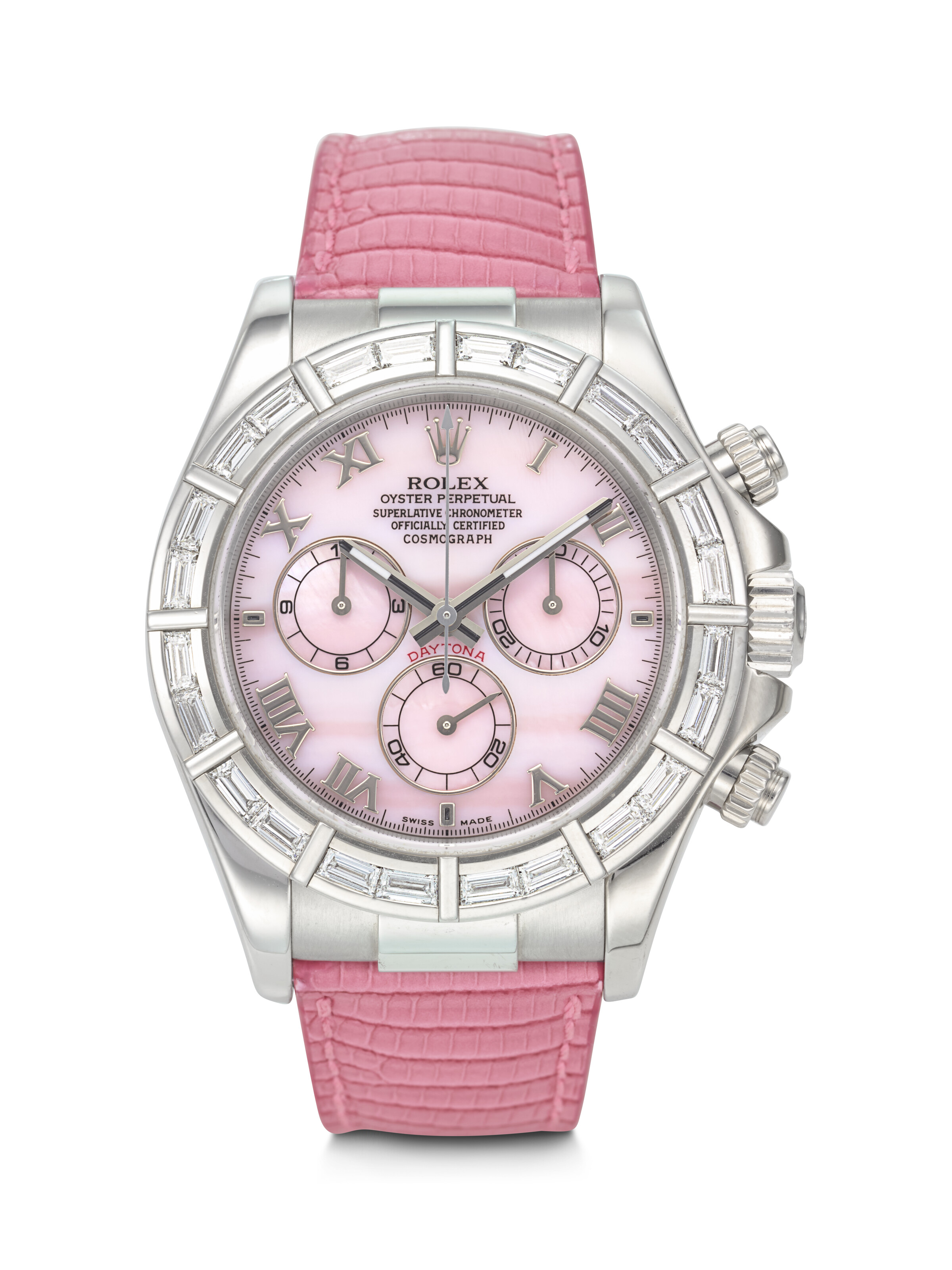 Rolex. An extremely rare, vibrant and attractive 18k white gold and baguette diamond-set automatic chronograph wristwatch with mother of pearl Dial Daytona 'Beach' mother of pearl model, ref. 116589, case no. D802350, c. 2005. Estimate: $120,000-240,000. Offered in Important Watches on 9 December 2025 at Christie’s in New York