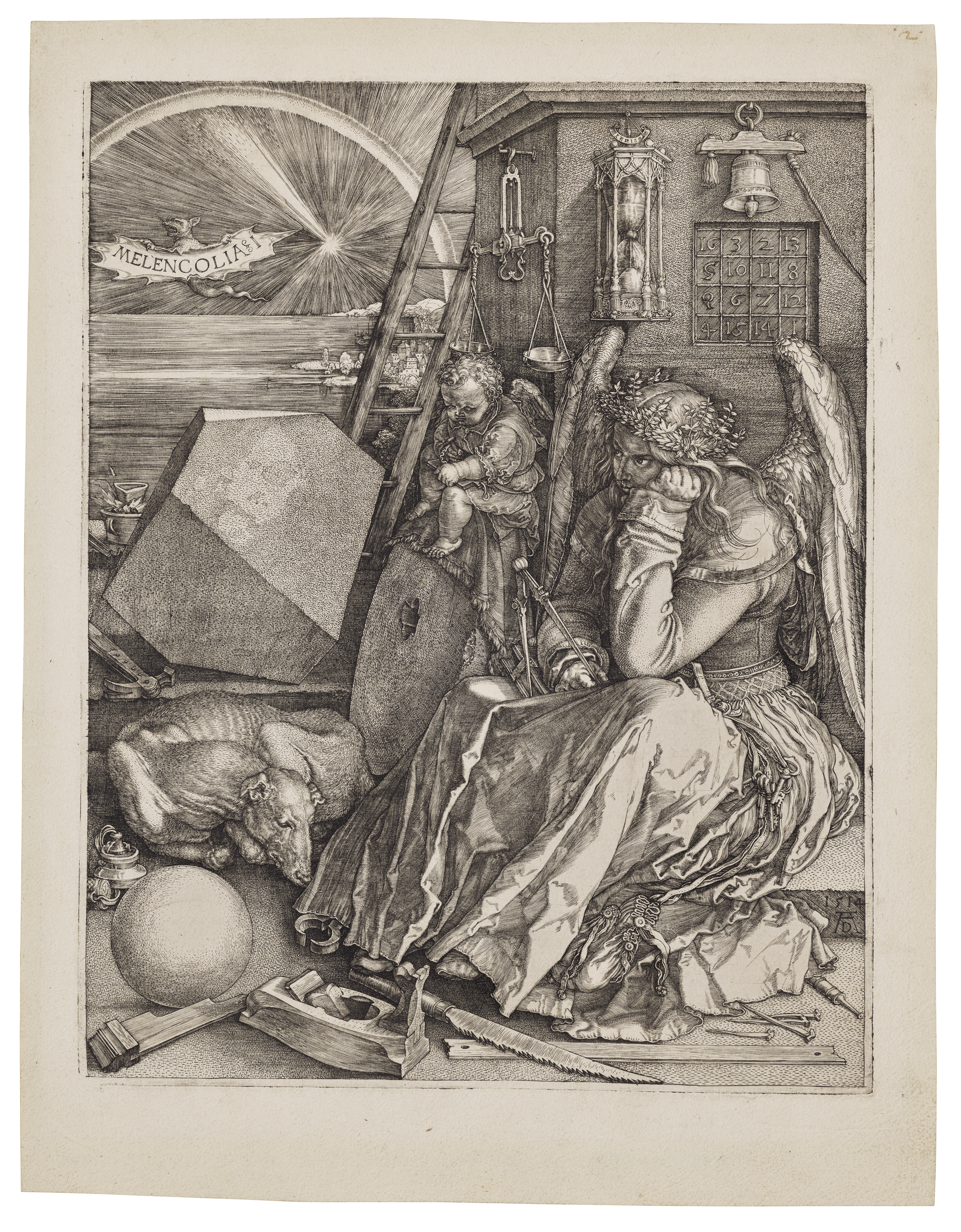 Albrecht Dürer (1471-1528), Melencolia I, 1514. Engraving on laid paper. Plate: 9½ x 7½ in (240 x 189 mm). Sheet: 11³⁄₁₆ x 8¹¹⁄₁₆ in (282 x 218 mm). Estimate: $300,000-500,000. Offered in Exceptional Impressions: The Alan and Marianne Schwartz Collection on 23 October 2024 at Christie’s in New York