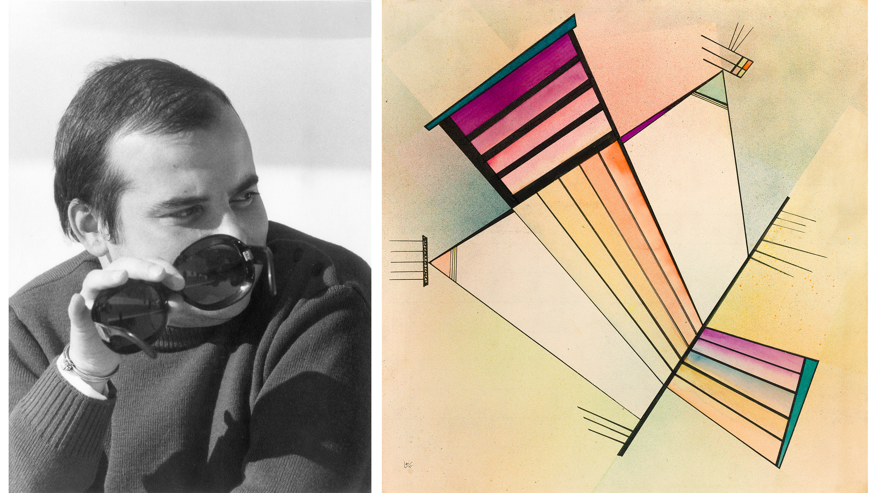 Left: Daniel Abadie in Antibes, 1974, photographed by Hans Hartung. Photo: © Hans Hartung. Fondation Hartung-Bergman. Right: Wassily Kandinsky (1866-1944), Standhaft, 1931. Watercolour, pen and India ink and spritztechnik on paper. 48.5 x 47.6 cm (19⅛ x 18¾ in). Sold for €482,600 on 30 September 2025 at Christie’s in Paris