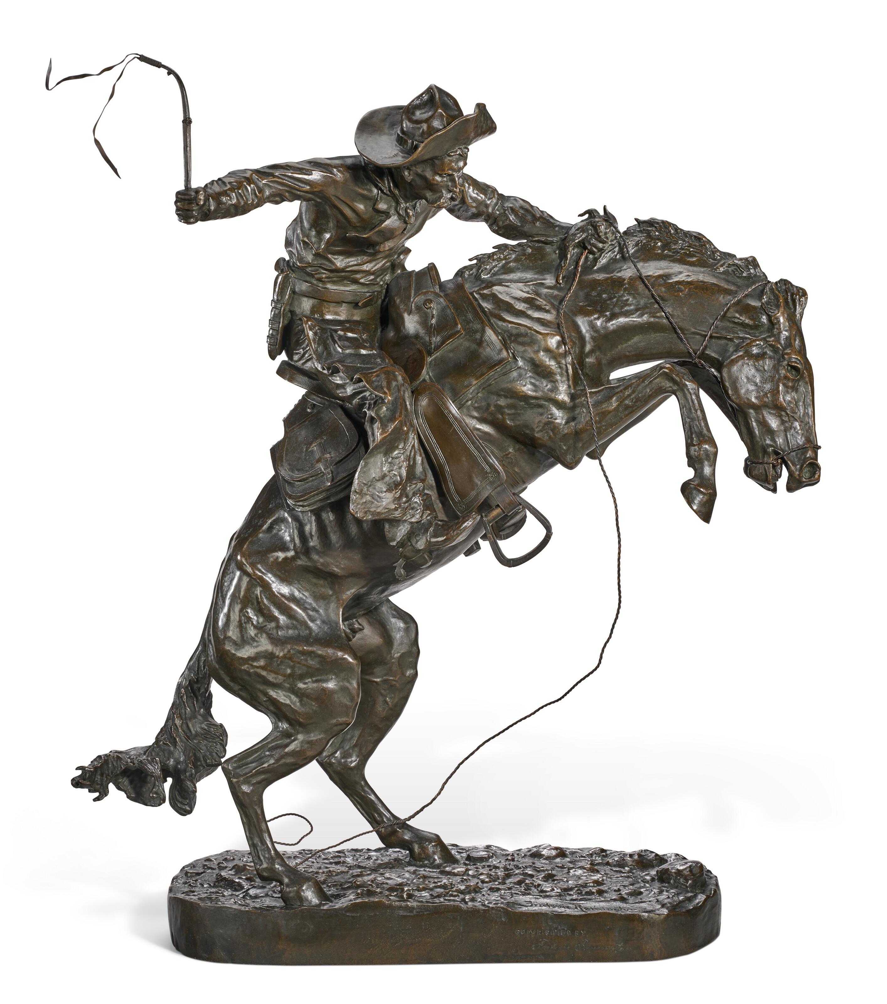 Frederic Remington (1861-1909), The Broncho Buster, modeled in 1895; cast by 1898. Bronze with brown patina. 23¾ in (60.3 cm) high. Estimate: $250,000-350,000. Offered in Visions of the West: The William I. Koch Collection Evening Sale on 20 January 2025 at Christie’s in New York