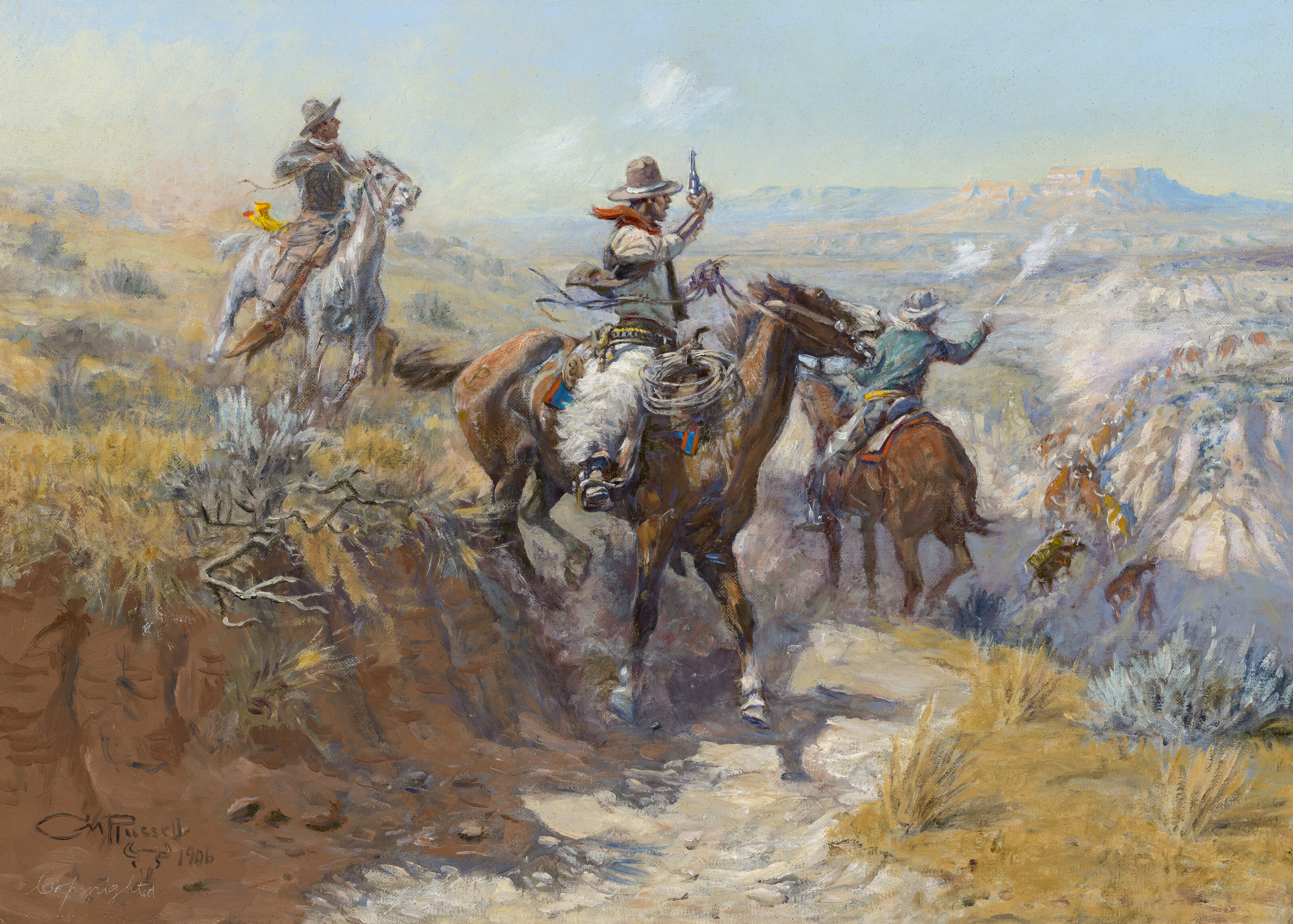 Known as the ‘cowboy artist’, Charles Marion Russell was interested in a life on the open range since he was a young boy. Born in St. Louis, Russell watched as explorers and traders frequented the state of Missouri dreaming of sweeping plains and valleys. He enrolled in life-drawing coursework at Washington University in St. Louis and even started school at the Burlington Military Academy in New Jersey, but his longing for a life in the West was stronger.