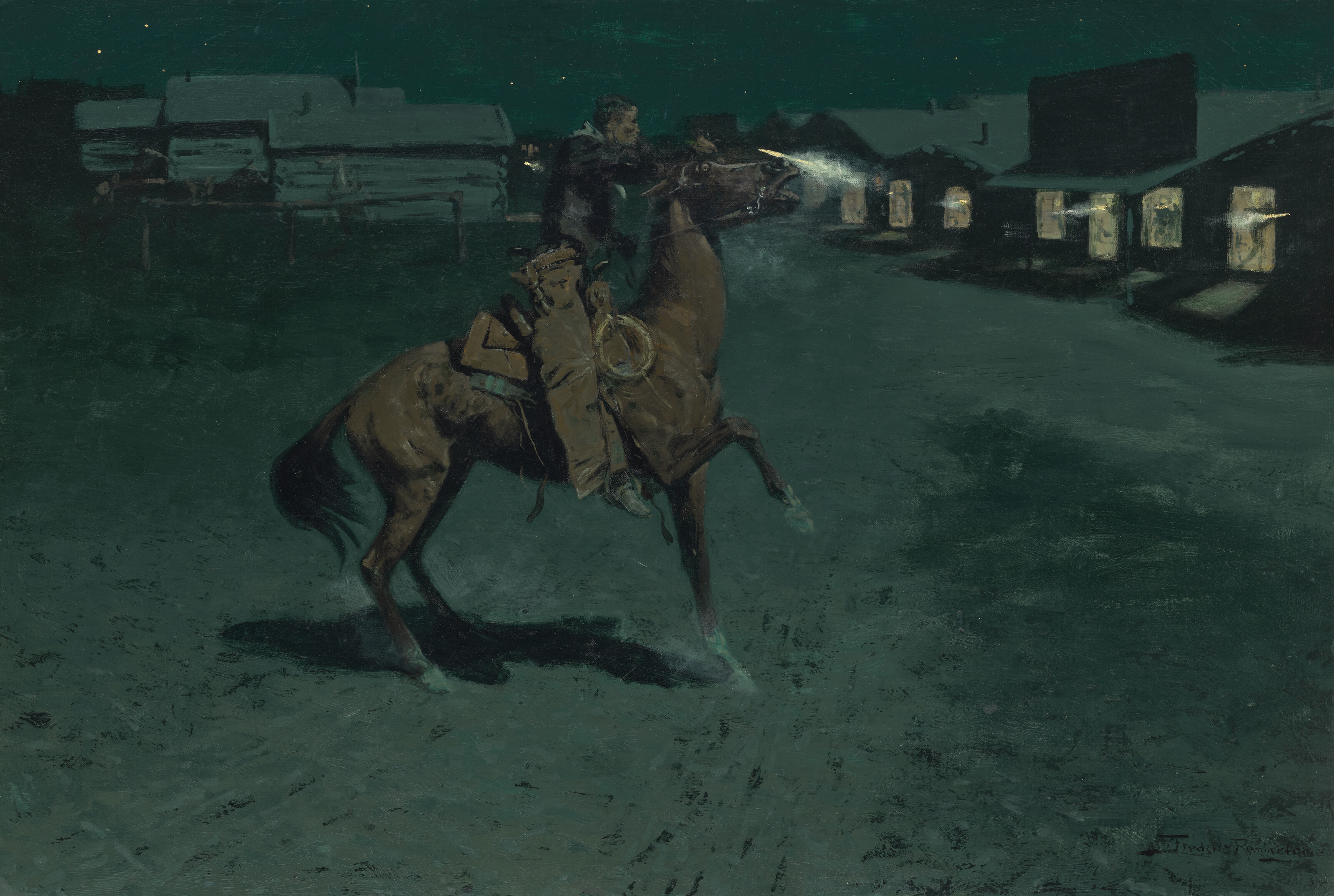 Frederic Remington (1861-1909), An Argument with the Town Marshall, c. 1905. Oil on canvas. 27 x 40 in (68.6 x 101.6 cm). Estimate: $4,000,000-6,000,000. Offered in Visions of the West: The William I. Koch Collection Evening Sale on 20 January 2026 at Christie’s in New York