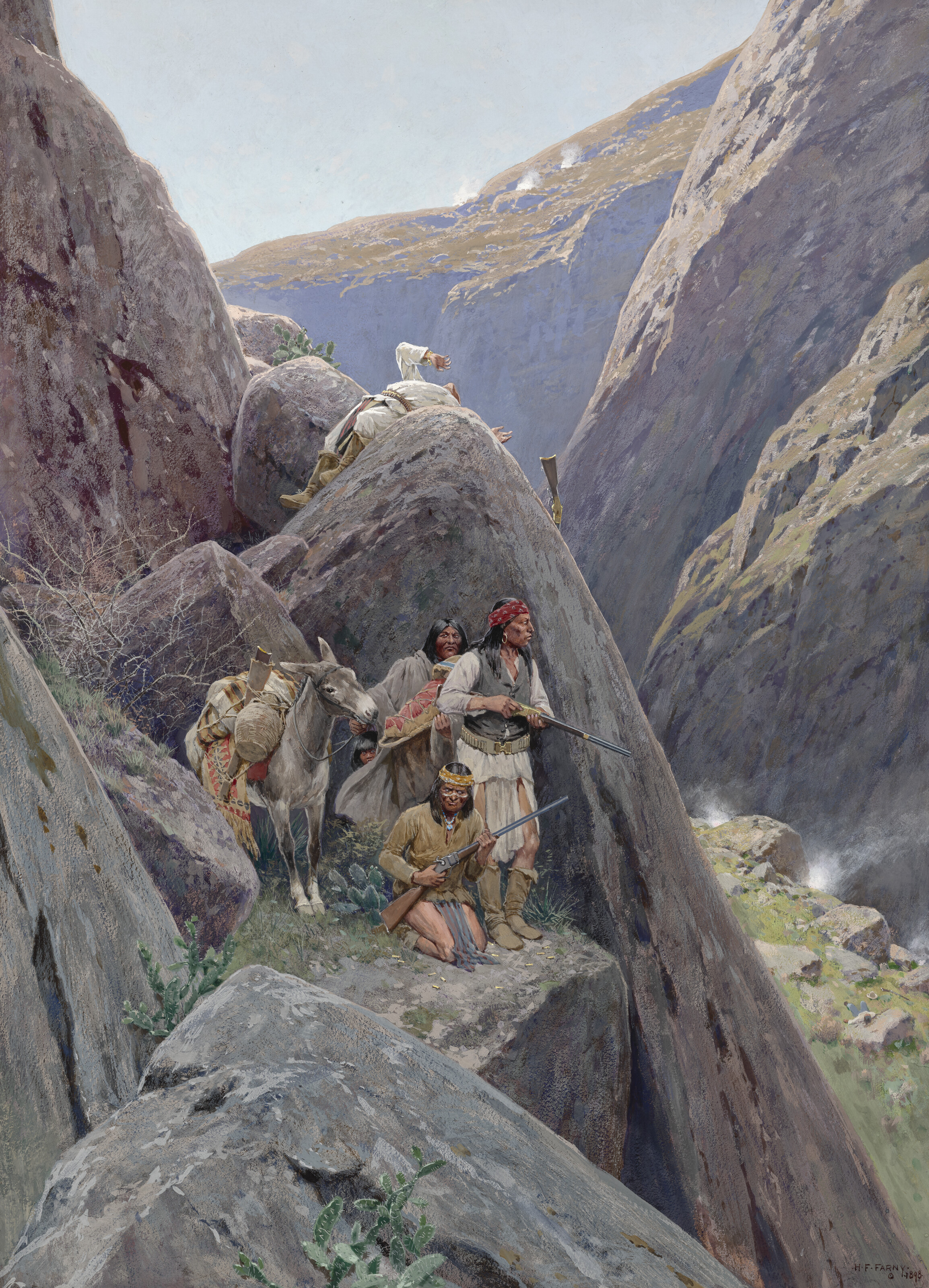 Henry F. Farny (1847-1916), Cornered, An Incident of the Apache War, 1898. Gouache on paper mounted on panel. 29 x 21 in (73.7 x 53.3 cm). Estimate: $500,000-700,000. Offered in Visions of the West: The William I. Koch Collection Evening Sale on 20 January 2026 at Christie’s in New York