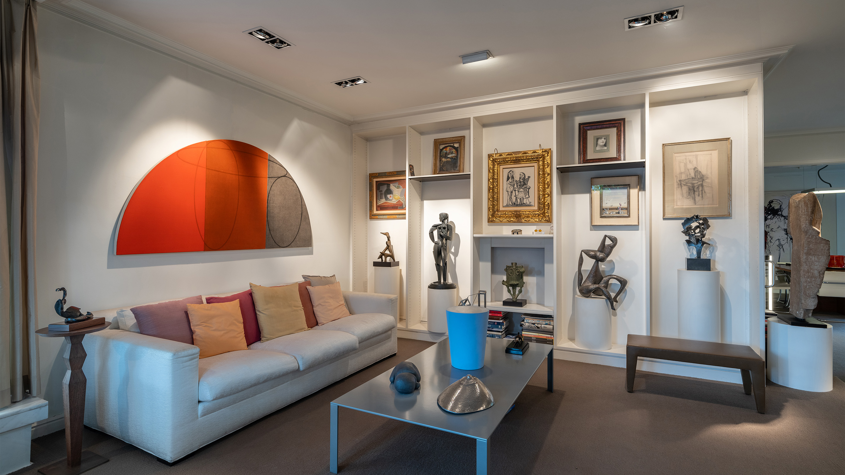 A sitting room in the Vanthournout residence. From left: a 1932 bronze, Petite bacchante, by Pablo Gargallo (estimate: £20,000-30,000), on the table next to the sofa, above which hangs Robert Mangold’s tryptich Curved Plane / Figure VII (Study B) from 1995-96 (£180,000-250,000). Set into the far wall are, left to right, top row: Juan Gris, Le citron, 1925 (£150,000-200,000); James Ensor, Le parasol, 1880 (£30,000-50,000); Pablo Picasso, Nu debout et femmes assises, 1939 (£3,000,000-5,000,000); Fernand Khnopff, Etude de femme, circa 1910 (£50,000-70,000); Yves Tanguy, Hérédité des qualités acquises, 1936 (£300,000-500,000); and a drawing by Alberto Giacometti. Bottom row: Jean (Hans) Arp, Squelette d’oiseau, 1947 (£40,000-60,000); Jacques Lipchitz, Jeune fille à la tresse, 1914 (£400,000-700,000); Joan Miró, Tête, 1970 (£80,000-120,000); a bronze by Henri Laurens; and Pablo Gargallo, Hommage à Chagall, 1933 (£80,000-120,000). On the coffee table are, clockwise from left: Antony Gormley, IRON BABY, 1999 (£180,000-250,000); Ettore Spalletti, Untitled (blue vase) (£10,000-15,000); Henry Moore, Two Piece Reclining Figure: Thin, 1976 (£30,000-50,000); and César, Le Sein (The Breast), 1967 (£3,000-5,000)