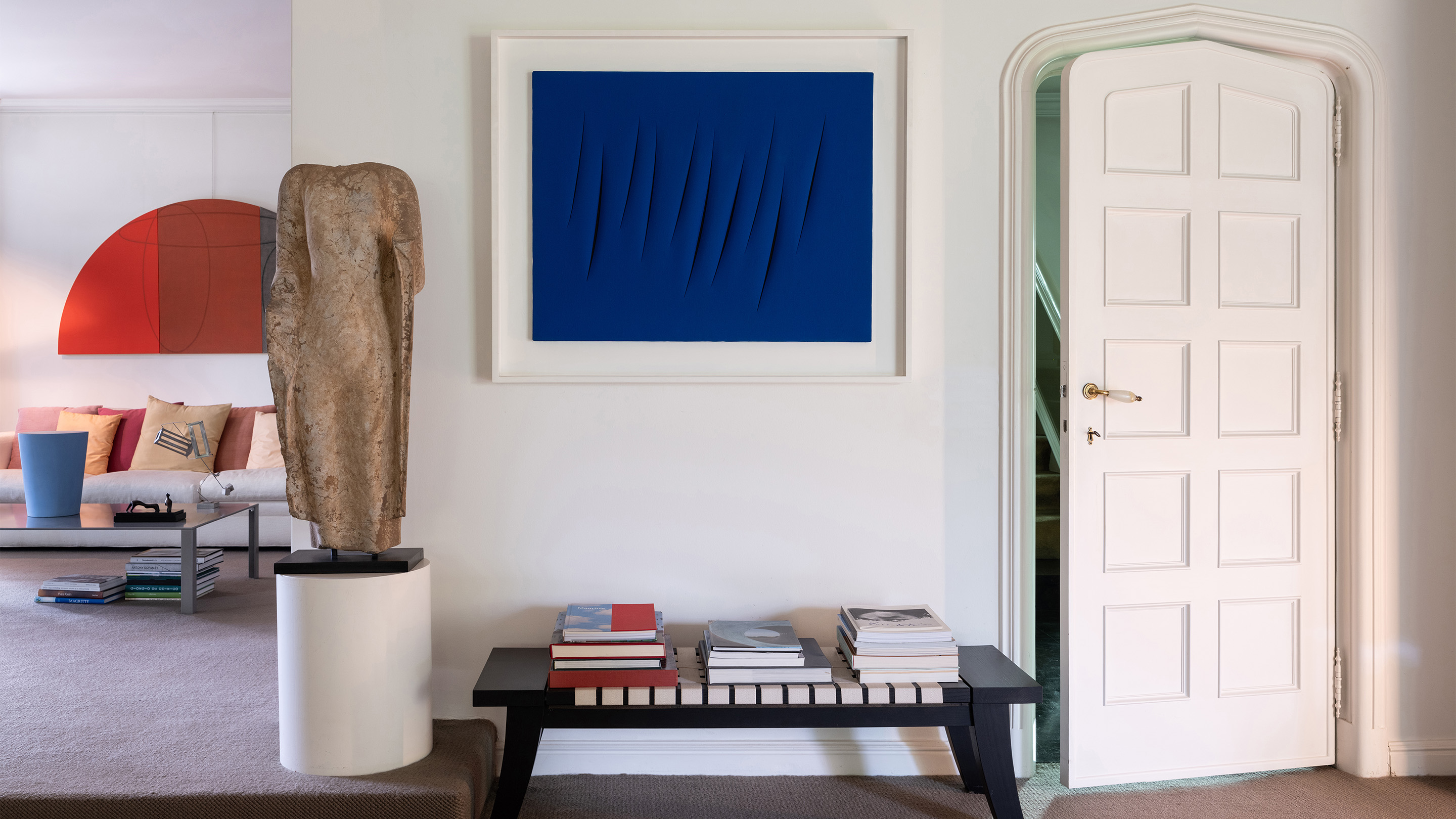 In the the Vanthournout’s residence, Lucio Fontana’s Concetto spaziale, Attese, 1964, a rare, 10-incision work from the artist’s iconic Tagli (‘Cuts’) cycle (estimate: £2,000,000-3,000,000). The room to the left features works by Robert Mangold, Ettore Spalletti, Henry Moore and George Rickey