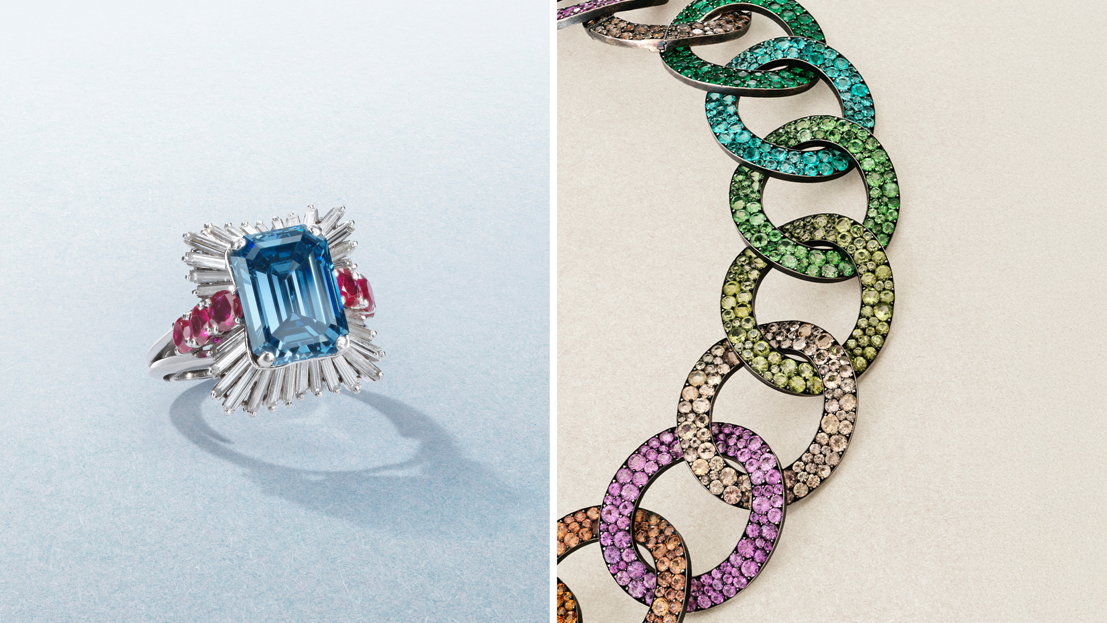 Left: A coloured diamond, diamond and ruby ‘Ballerina’ ring, mounted by Boucheron. Sold for CHF 10,640,000. Right: A JAR multi-gem chain necklace. Sold for CHF 352,800. Both offered on 14 May 2025 at Christie’s in Geneva