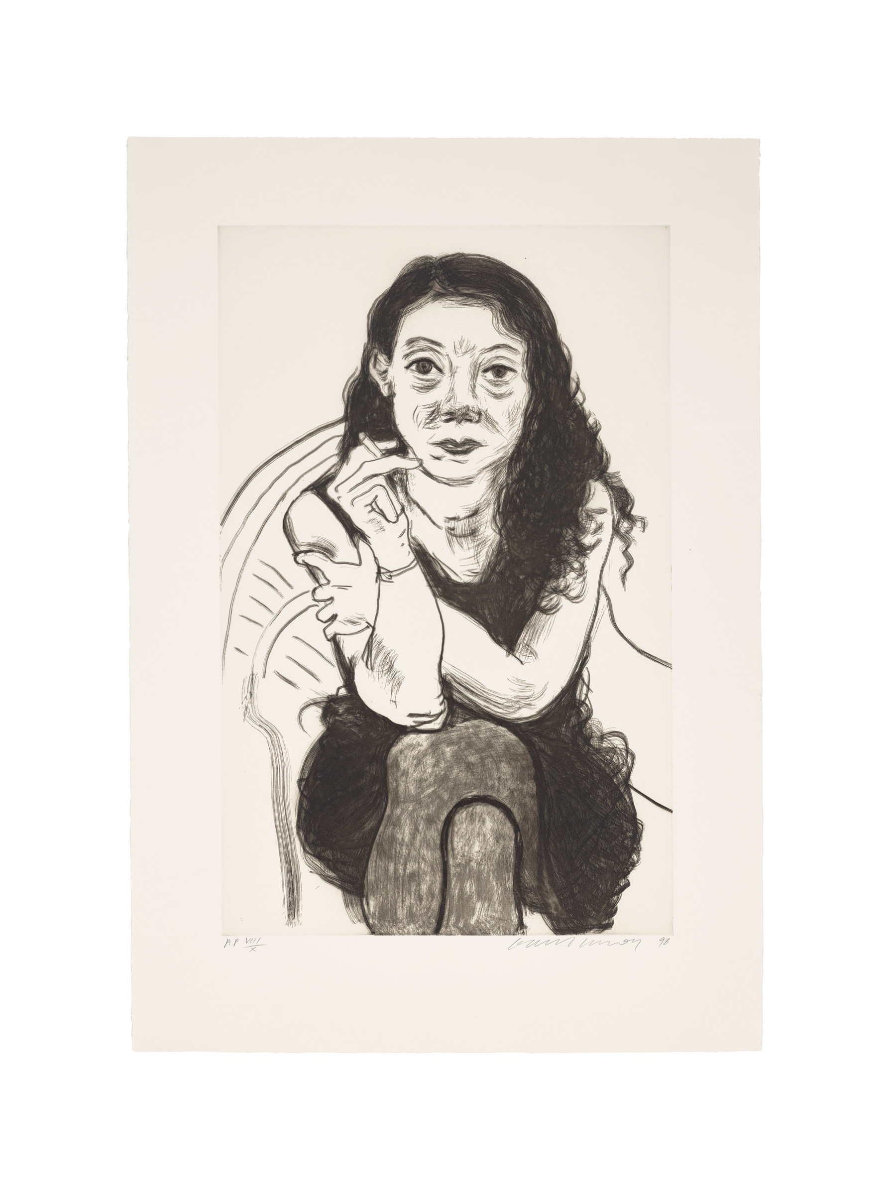 David Hockney, Brenda with a cigarette, 1998. Etching on Somerset Textured paper. Image: 34 x 21 in (86.36 x 53.34 cm). Sheet: 43 x 30 in (109.2 x 76.2 cm). Estimate: $15,000-25,000. Offered in Prints & Multiples on 27 October & 28 October 2023 at Christie's New York