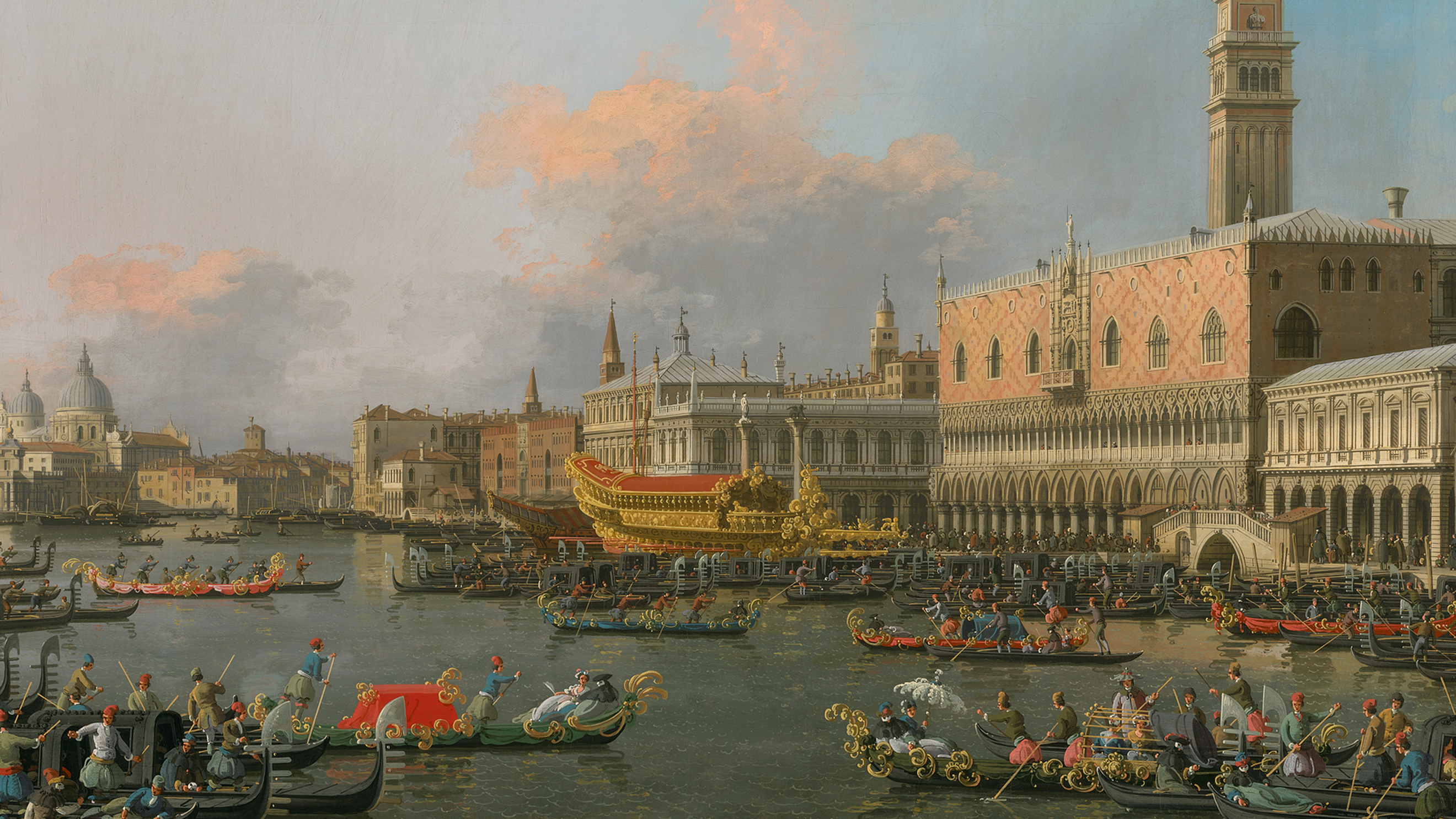 Occupying the scene’s centre is the Bucintoro, with its resplendent red roof and gilded decoration. It is now afternoon, and the vessel has recently returned to the Molo after its annual Ascension Day journey into the Adriatic. There the Doge would cast a ring into the water, to mark a symbolic marriage between Venice and the sea.