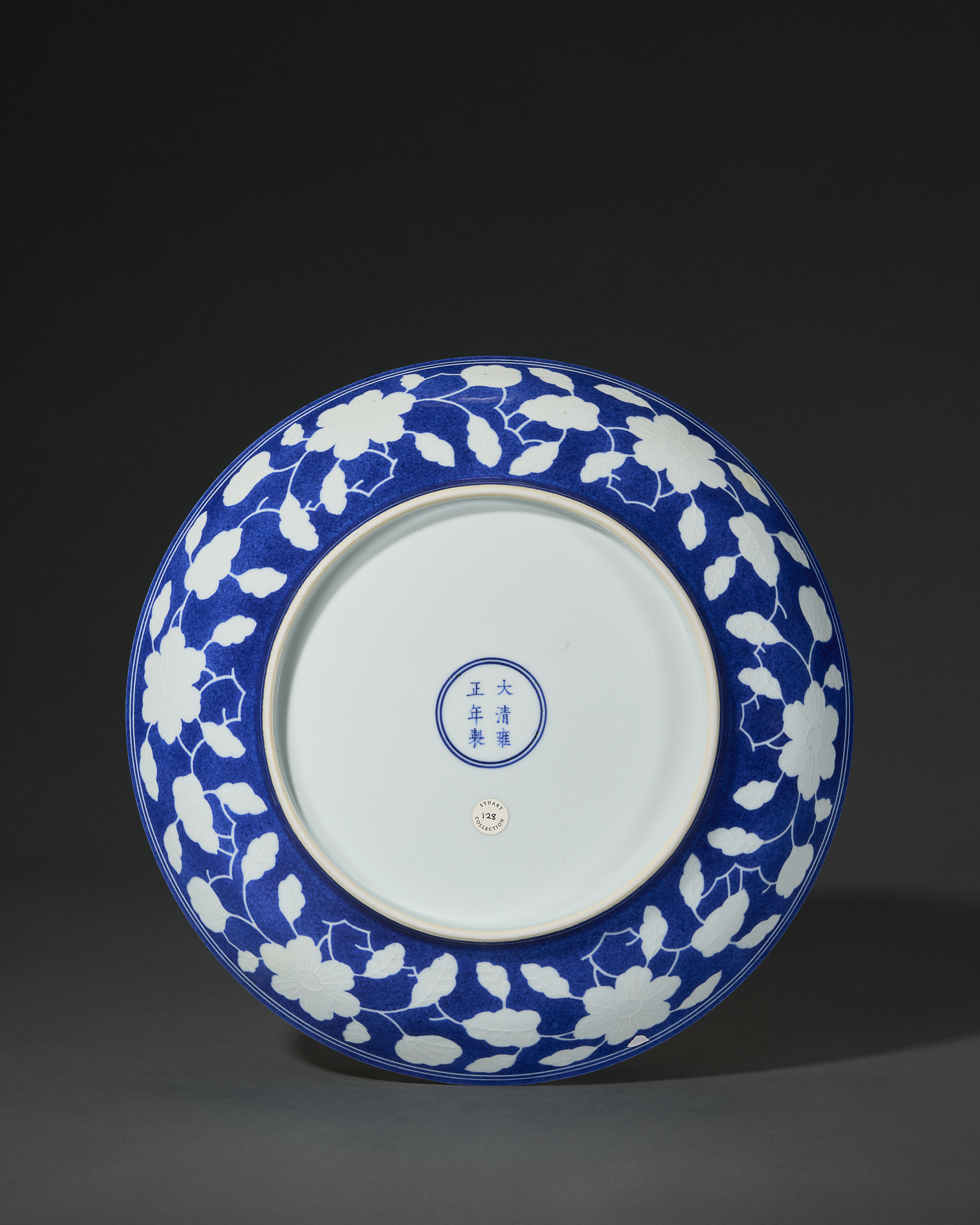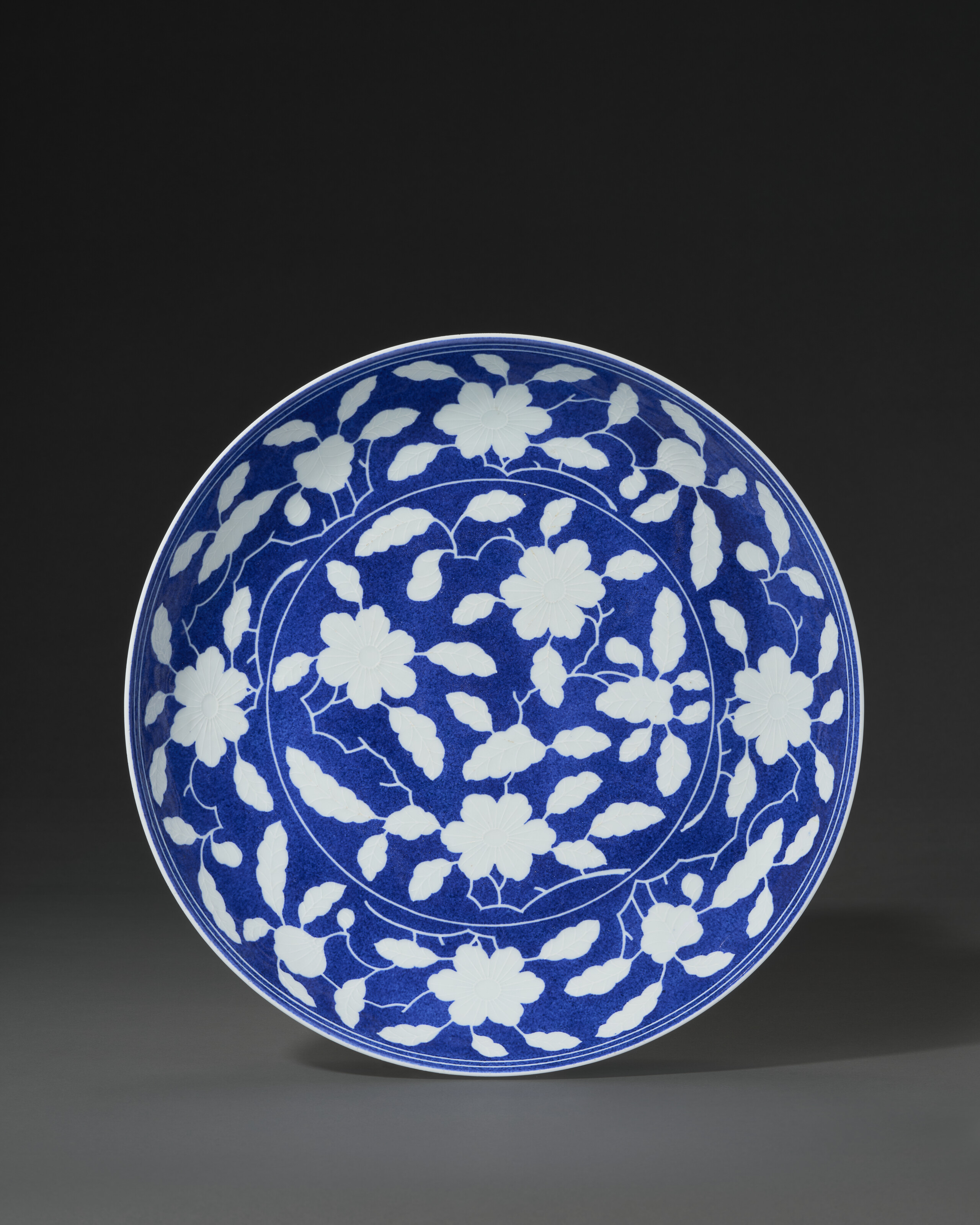A rare reserve-decorated blue-ground ‘gardenia’ dish, Yongzheng six-character mark in underglaze blue within a double circle and of the period (1723-1735). 13 in (33 cm) diam. Estimate: $100,000-150,000. Offered in Important Chinese Art on 26-27 March 2026 at Christie’s in New York