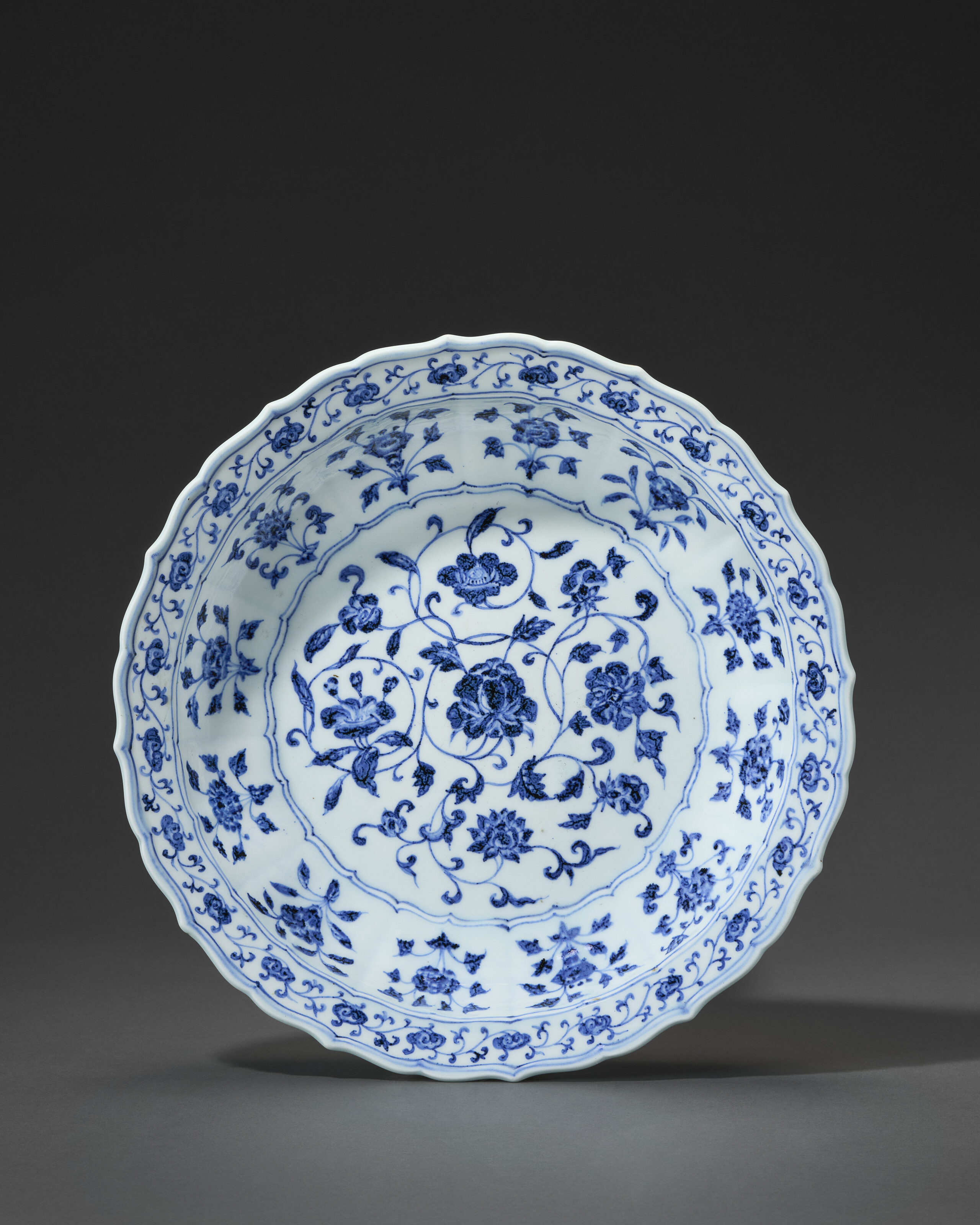 A rare large blue and white bracket-lobed ‘floral scroll’ dish, Yongle period (1403-1425). 15 in (38.1 cm) diam. Estimate: $300,000-500,000. Offered in Important Chinese Art on 26-27 March 2026 at Christie’s in New York
