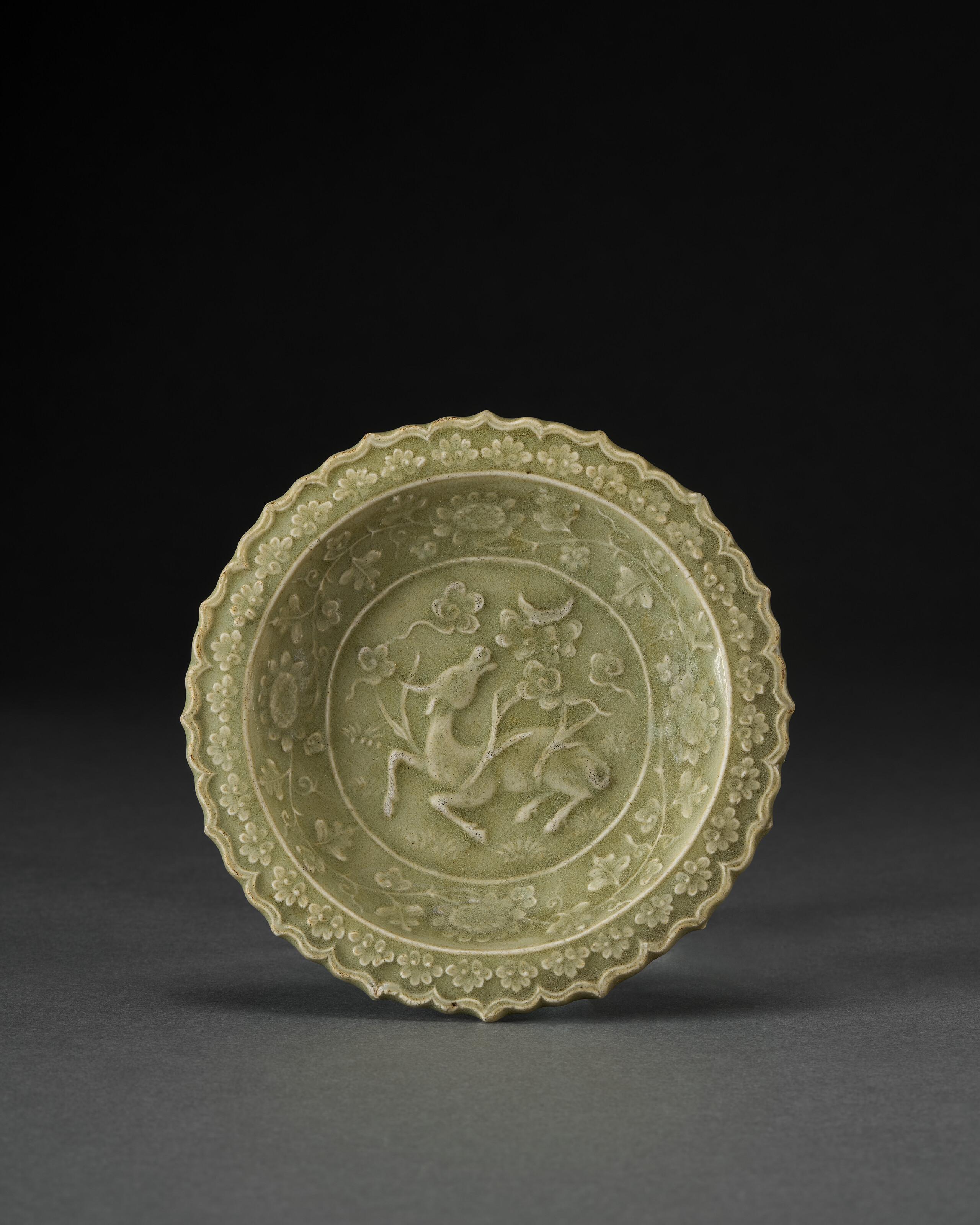 A rare small molded Longquan celadon ‘xiniu’ dish, Yuan dynasty, mid-14th century. 5¾ in (14.6 cm) diam. Estimate: $30,000-50,000. Offered in Important Chinese Art on 26-27 March 2026 at Christie’s in New York