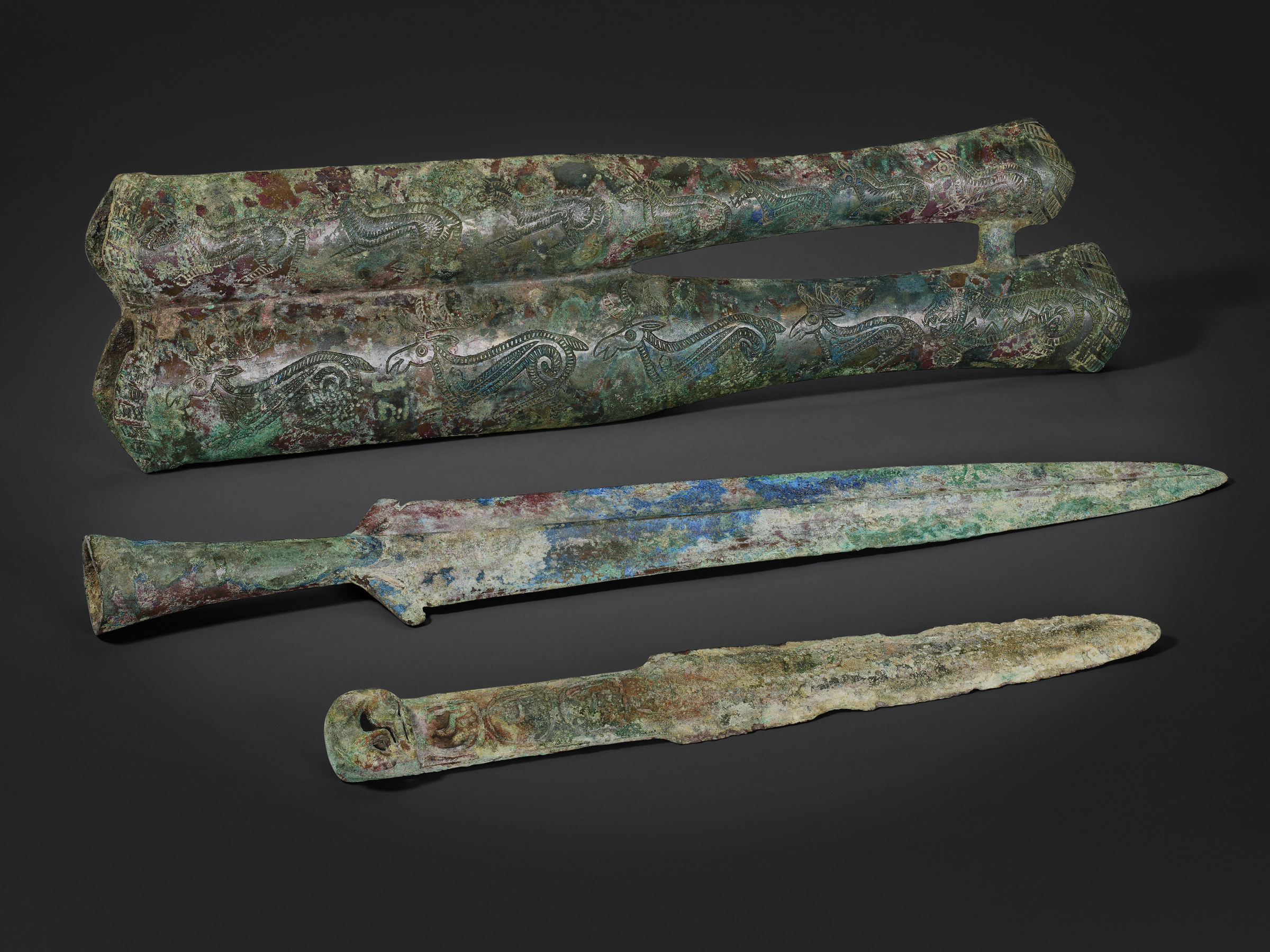A rare bronze double scabbard with two weapons, late Western - early Eastern Zhou period, 9th-6th century BC. The scabbard: 10⁵⁄₁₆ in (26.2 cm) long. Estimate: $8,000-12,000. Offered in Important Chinese Furniture and Works of Art on 18-19 September 2025 at Christie’s in New York
