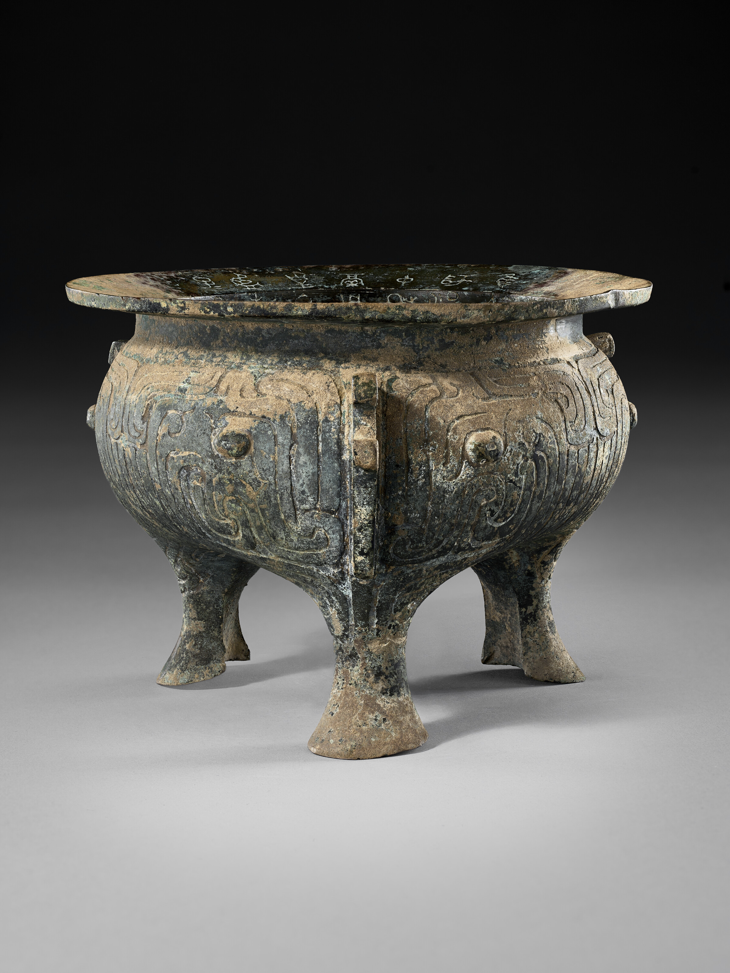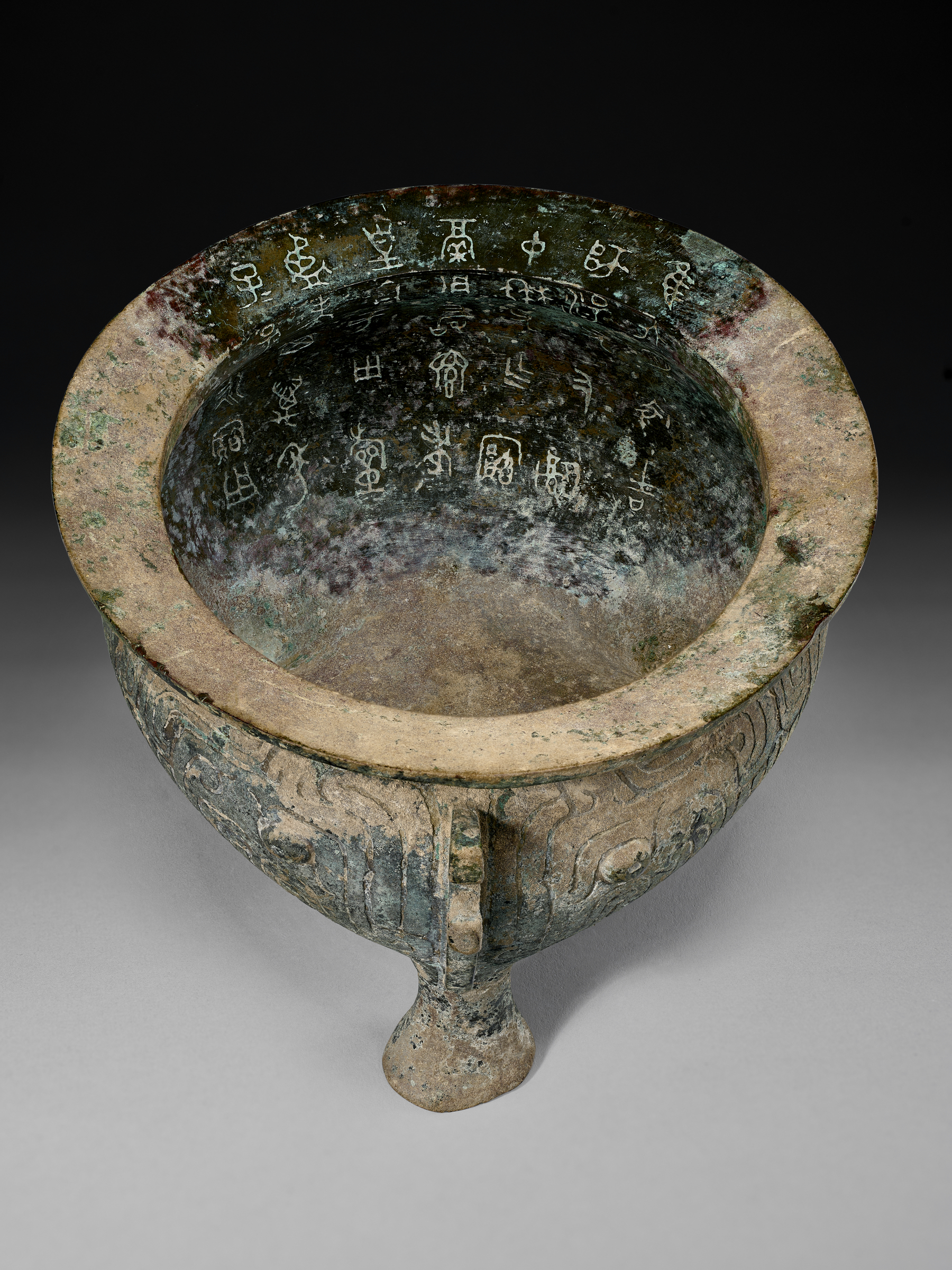 One side of the rim and the interior of the vessel is cast with a 39-character inscription which may be translated as 'On the first auspicious day of the sixth month, the respected official Shi Tangfu oversaw the work; Zhong Nanfu commissioned this precious li vessel to make offerings in filial honor to the ancestors and to his grand great ancestor, and to pray for long life. [May it] endure for ten thousand years; [may his] descendants treasure and use it forever.'