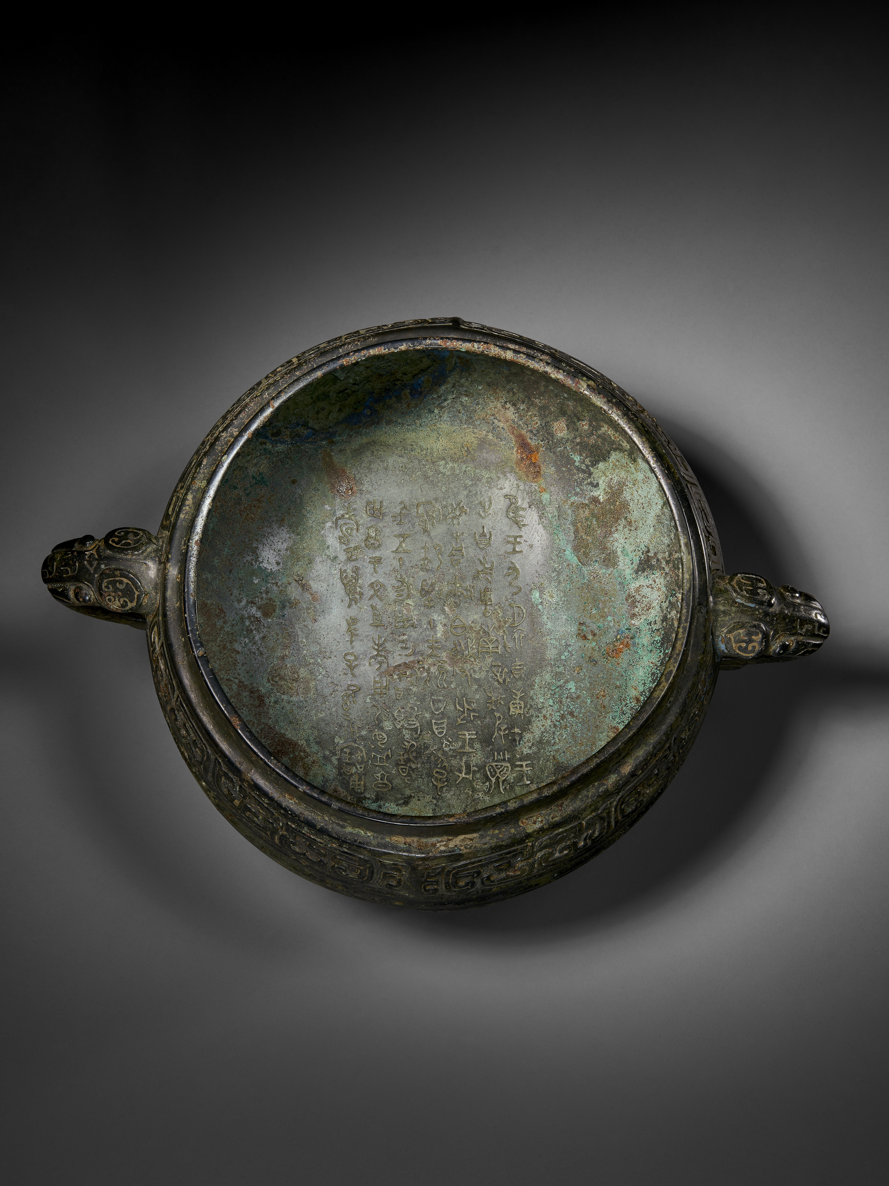Late Shang-dynasty and early Western Zhou-dynasty (11th-10th century BC) vessels tend to have simpler inscriptions, while those on Western Zhou-dynasty vessels (9th-8th century BC) tend to be longer and more complex. Inscriptions make a vessel more rare, and add to its value. The interior of the above vessel is cast with a sixty-seven-character inscription which may be translated as 'On the gengwu day, the first auspicious day of the ninth month, the king set out from Chengzhou to campaign south and subdue the fu-zi. In the regions of Ying, Tong, and Yue, Bo Xian Fu followed the king on campaign, and seized and interrogated ten men, took the left ears of twenty enemies as trophies, and captured prisoners. As a reward he received fifty jun of metal. With this he made this precious gui vessel in order to proclaim and exalt the [king’s] beneficence, to make offerings to his ancestors, and to accept the bestowed favor. [May he] enjoy long life of ten thousand years; [may] sons and grandsons treasure and use it forever.'