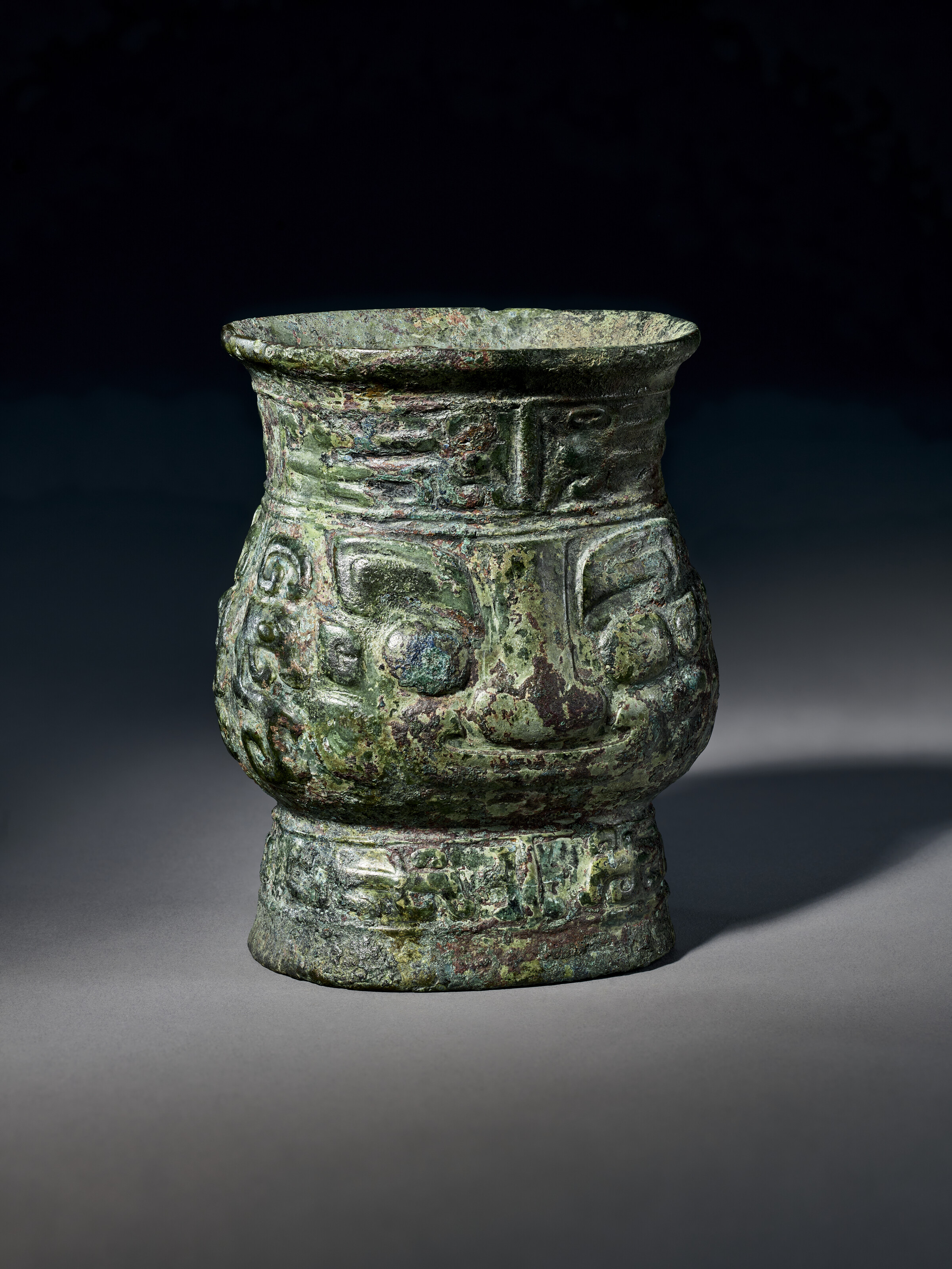 A bronze ritual wine vessel, zun, mid-late Shang dynasty, 13th-11th century BC. 7⅜ in (18.8 cm) across, padauk stand. Sold for $30,240 in Important Chinese Furniture and Works of Art on 21 March 2025 at Christie’s in New York
