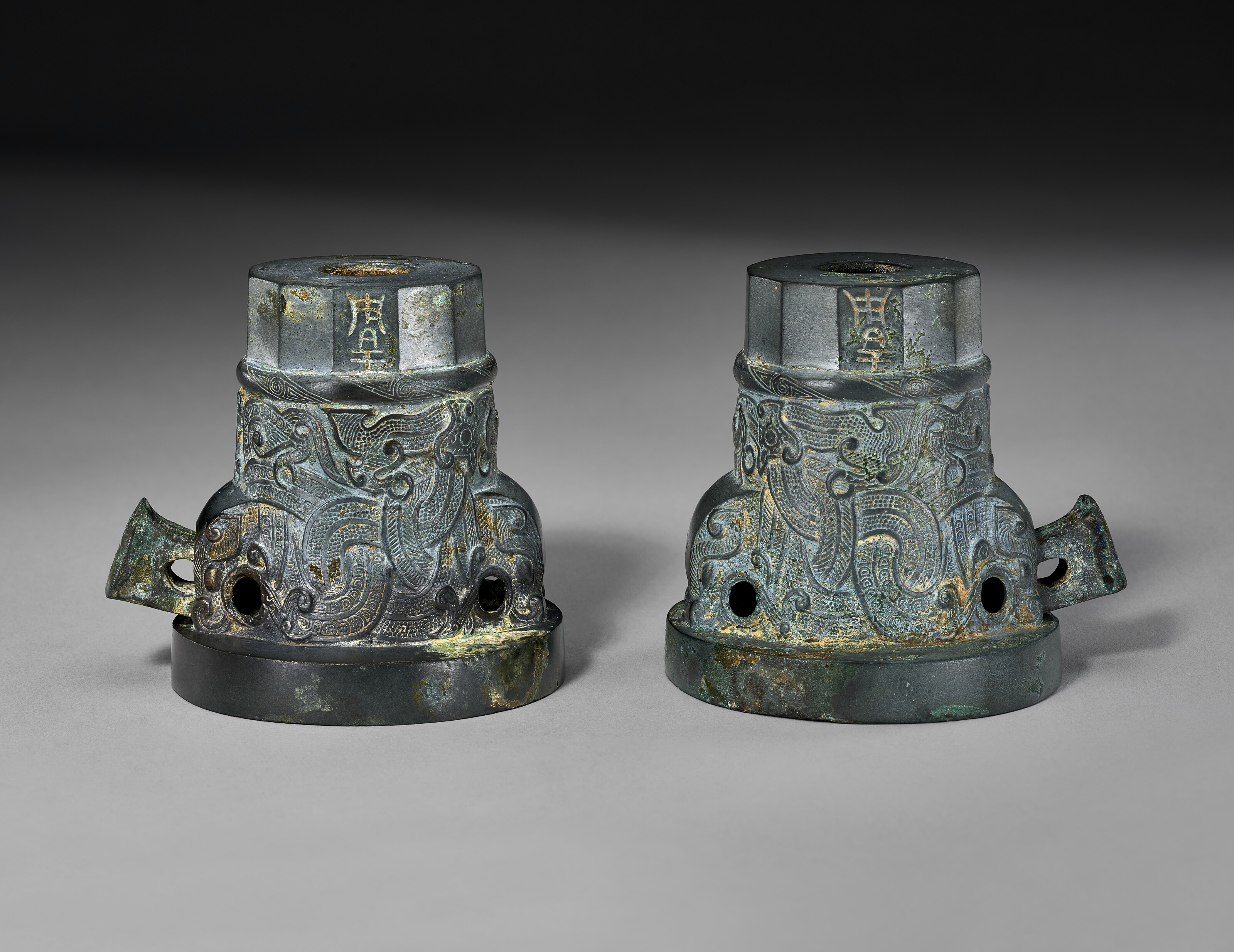 A pair of bronze axle caps and linch pins, wei xia, late Spring and Autumn period, first half 6th century-476 BC. 3⅜ in (8.6 cm) high. Estimate: $20,000-30,000. Offered in Important Chinese Art on 26-27 March 2026 at Christie’s in New York