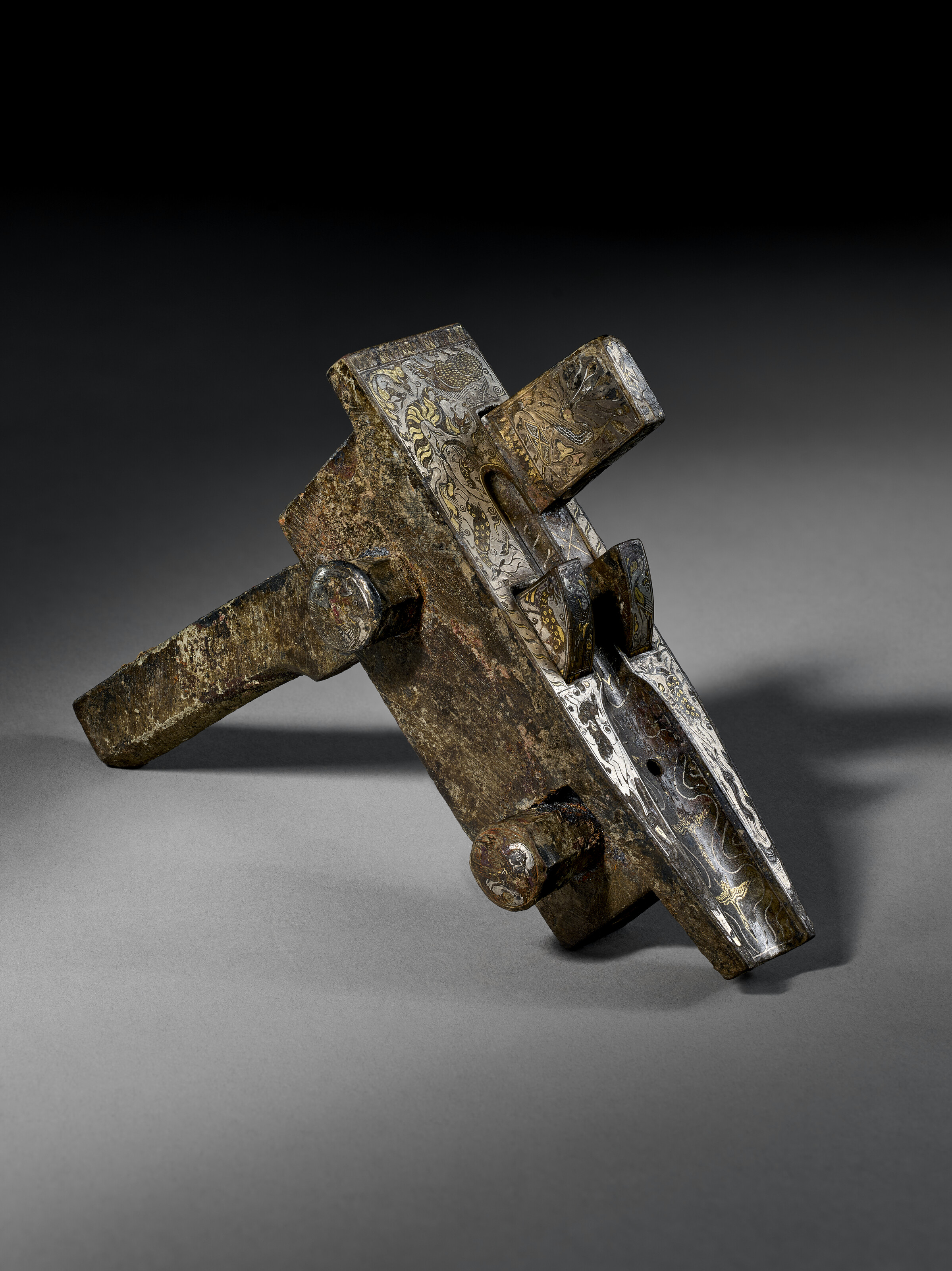A very rare and important gold and silver-inlaid bronze crossbow mechanism, nu, Western Han dynasty (206 BC-8 AD). 4⁷⁄₁₆ in (11.2 cm) long. Estimate: $150,000-250,000. Offered in Important Chinese Art on 26-27 March 2026 at Christie’s in New York