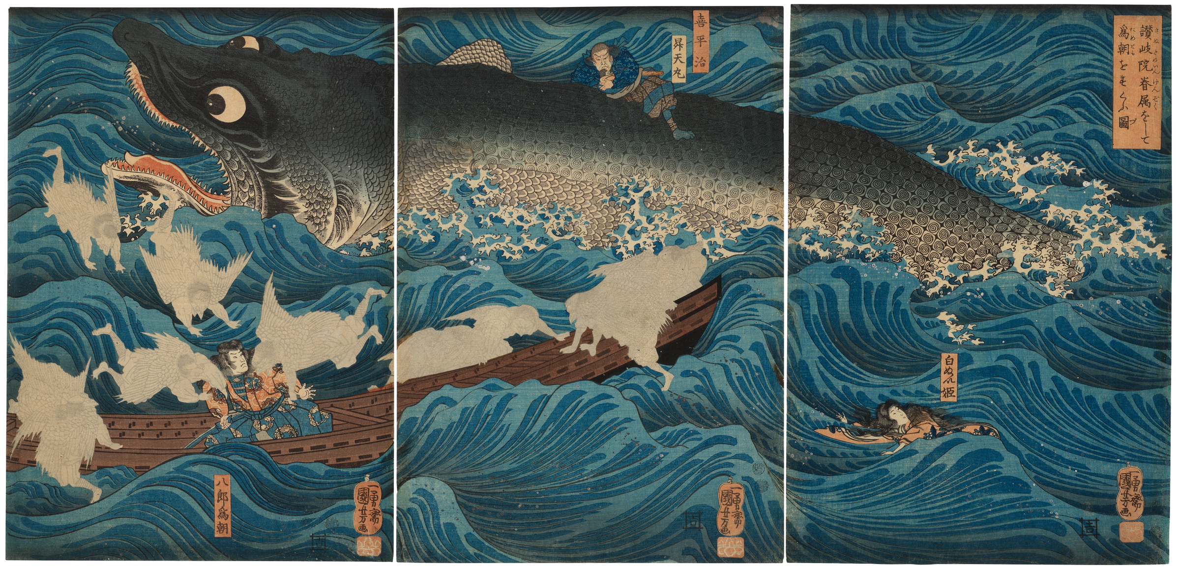 Utagawa Kuniyoshi (1797-1861), Miyamoto no Musashi Attacking the Giant Whale. Woodblock print, 1847-50. Oban triptych: 14¼ x 9⅝ in (36 x 24.5 cm). Sold for HK$1,875,000 on 25 November 2018 at Christie’s in Hong Kong