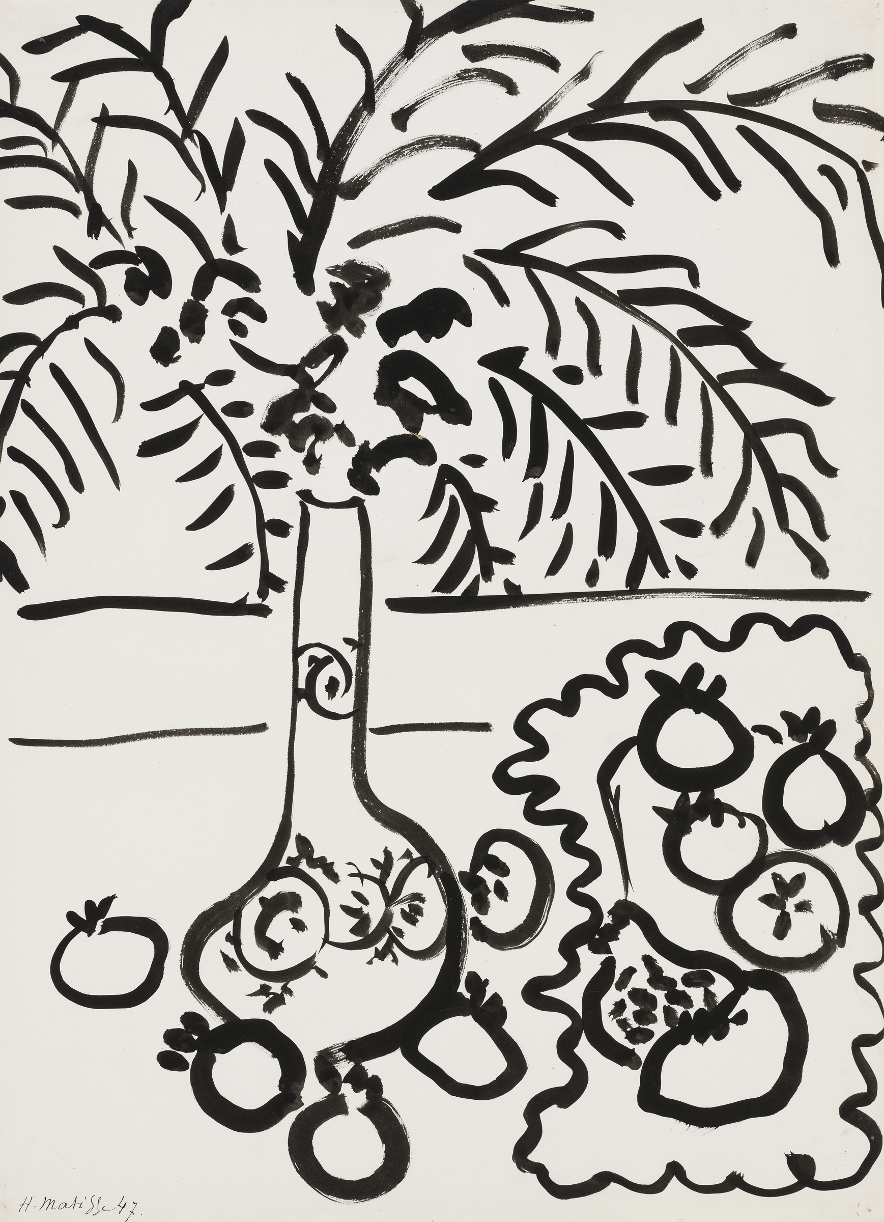 Henri Matisse (1869-1954), Nature morte, fougères et grenades, 1947. Brush and India ink on paper. 30 x 22 in (76 x 56 cm). Estimate: $1,500,000-2,500,000. Offered in 20th Century Evening Sale on 18 May 2026 at Christie’s in New York