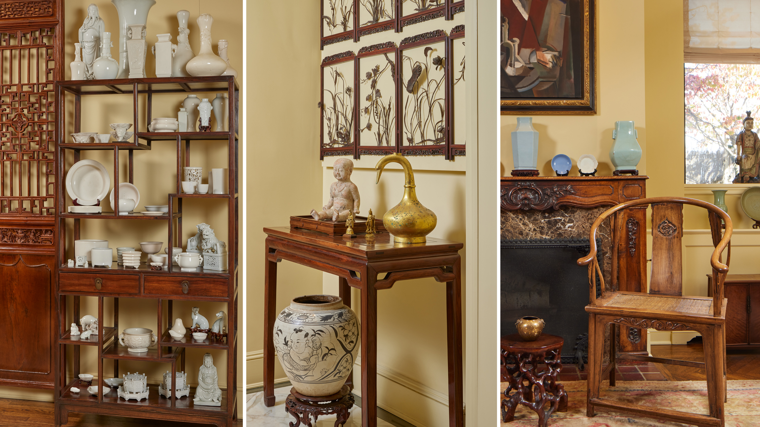 Her curation produced a dramatic effect in each room, such as the dining room filled with Qing dynasty Dehua porcelains. Named for the county in Fujian province where they were produced, these porcelains have a radiant white colour owing to the local characteristics of the clay, notably its low iron content.