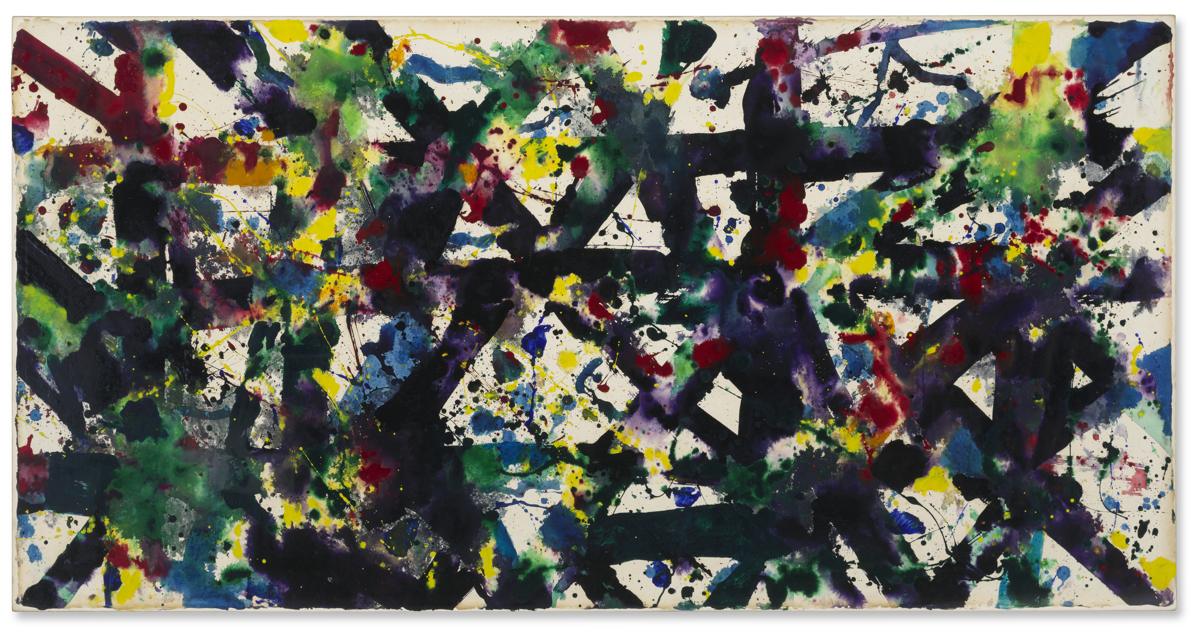 Sam Francis (1923-1994), Untitled, 1977-1978. Acrylic on rice paper mounted on paper mounted on canvas. 37¼ x 72½ in (94.6 x 184.2 cm). Estimate: $200,000-300,000. Offered in Post-War to Present on 26 February 2026 at Christie’s in New York