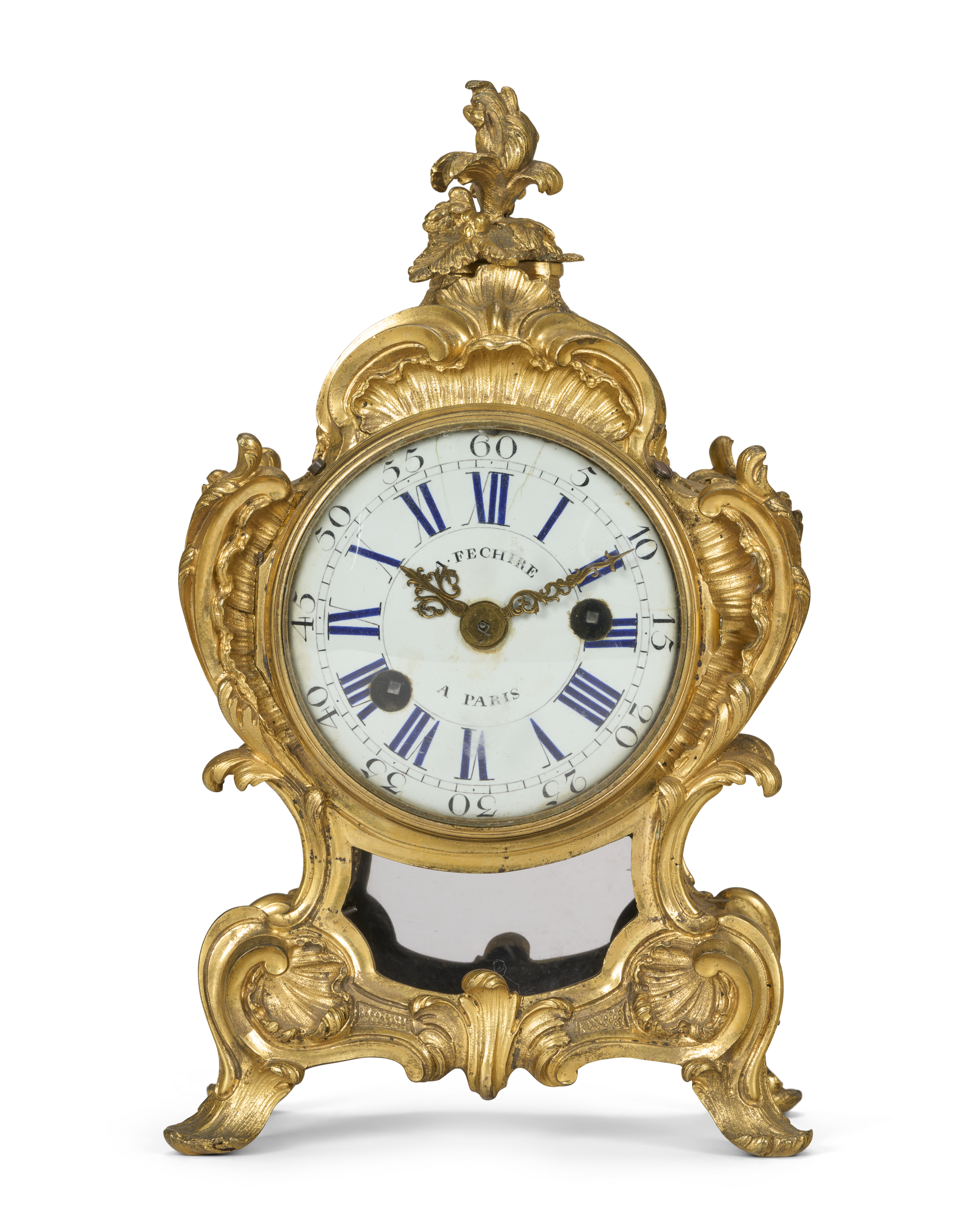 A Louis XV ormolu mantel clock, the case stamped St. Germain, the dial and movement signed a Fechire a Paris, c. 1750. 11¾ in (30 cm) high, 7 in (18 cm) wide. Estimate: $3,000-5,000. Offered in Collections: Property from the Estate of Stephen Newman and the Collection of Peter Van Slyke, Part II from 7-21 October 2025 at Christie’s in New York