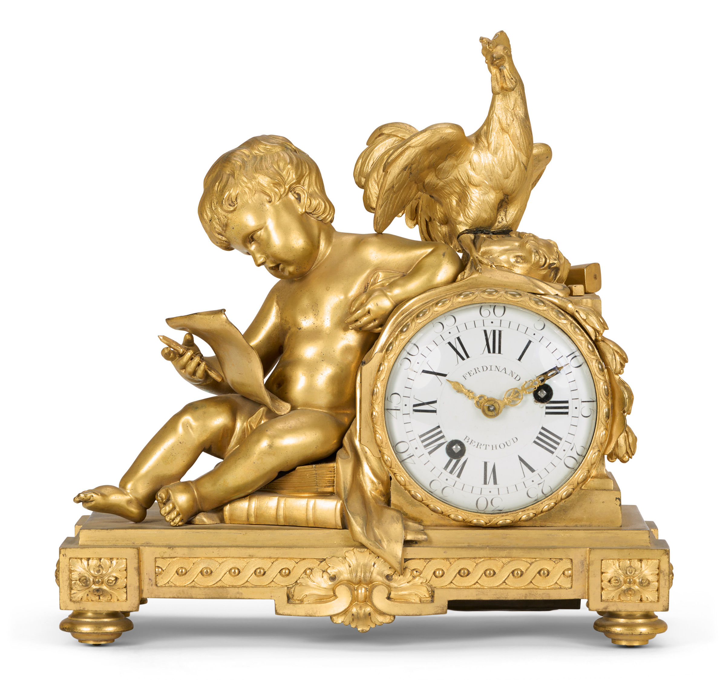 A Louis XVI ormolu mantel clock, the dial and movement signed Ferdinand Berthoud, c. 1775. 12 in (30.5 cm) high, 11¾ in (30 cm) wide. Estimate: $4,000-6,000. Offered in Collections: Property from the Estate of Stephen Newman and the Collection of Peter Van Slyke, Part II from 7-21 October 2025 at Christie’s in New York