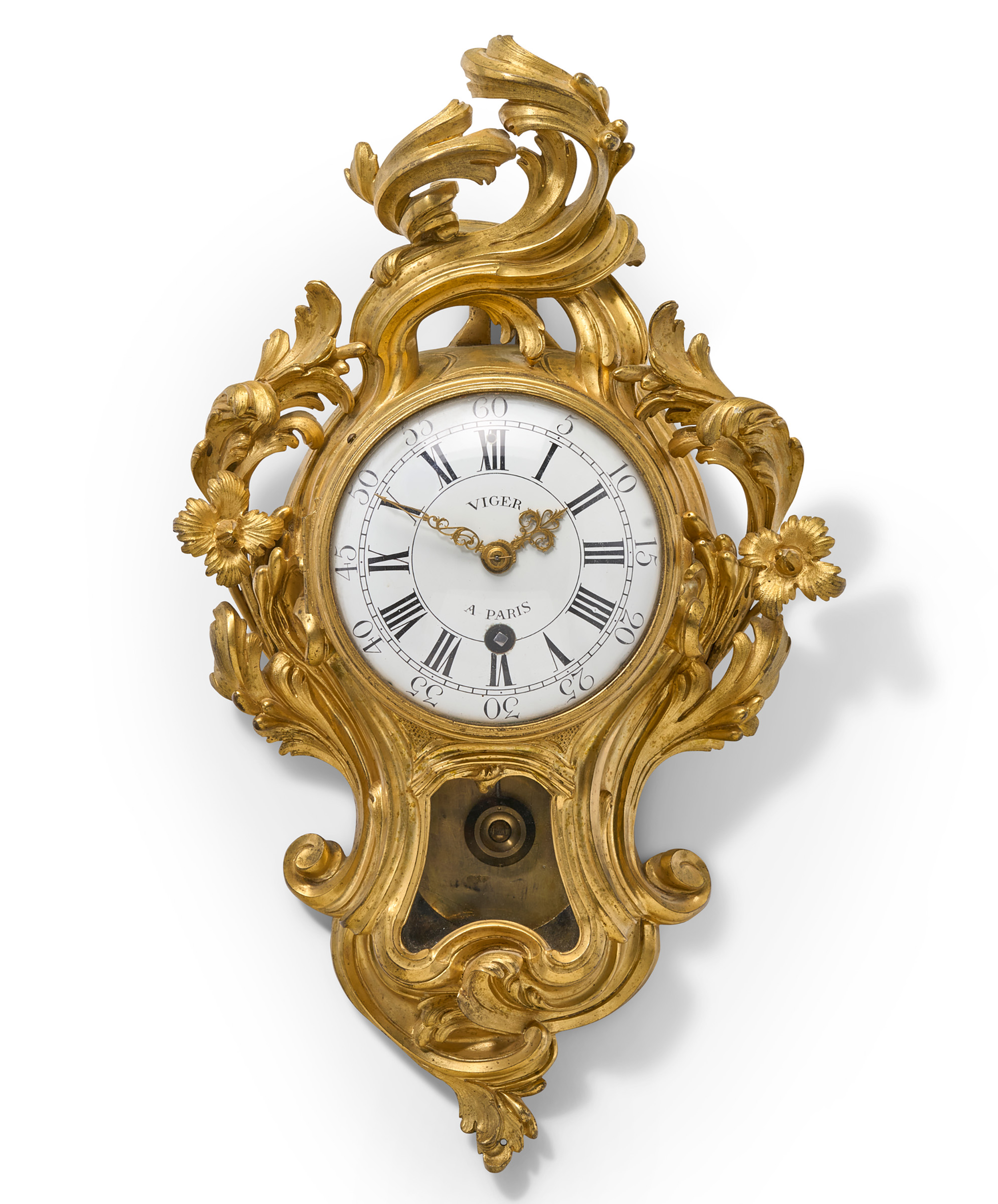 A Louis XV ormolu cartel clock, the case stamped St. Germain, the dial and movement signed Viger a Paris, c. 1755. 19½ in (50 cm) high, 11½ in (29.5 cm) wide. Estimate: $4,000-6,000. Offered in Collections: Property from the Estate of Stephen Newman and the Collection of Peter Van Slyke, Part II from 7-21 October 2025 at Christie’s in New York