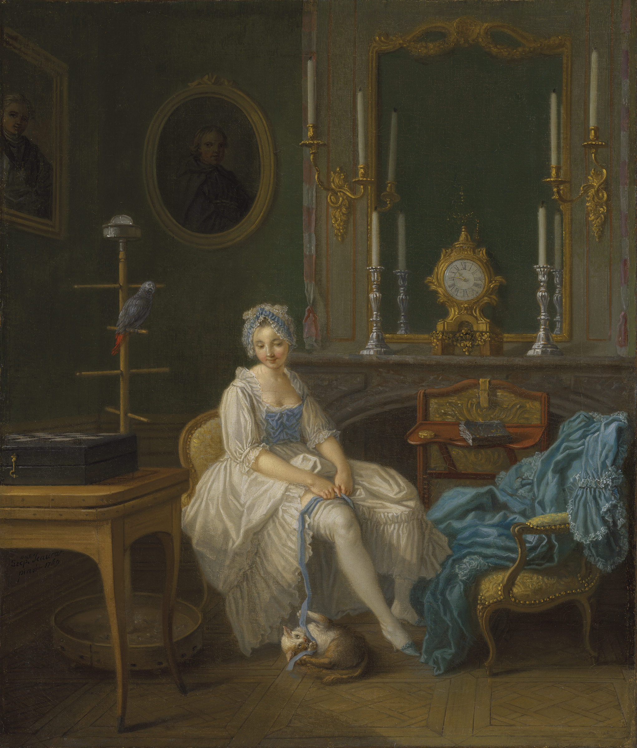 Étienne Jeaurat (1688-1789): The interior of a boudoir, with a lady in a white and blue dress. On the fireplace is a late Louis XV ormolu mantel clock.