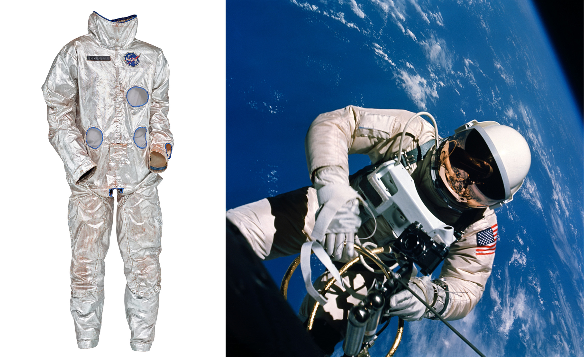 Left: David Clark & Co, A Project Gemini spacesuit cover-layer, January 1964. Aluminized nylon. Estimate: $80,000 - 120,000. Offered in Pushing Boundaries: Ingenuity from the Paul G. Allen Collection on 10 September 2024 at Christie’s in New York; Right: Astronaut Edward White floats outside the Gemini IV spacecraft, 1965