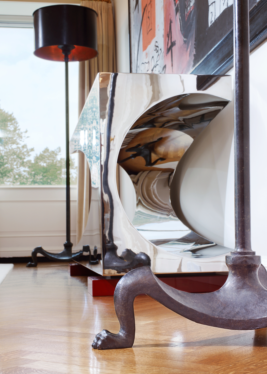 In addition to eye-catching lighting, Van der Straeten has a penchant for architectural console tables. Two iterations in the client’s home can also be found in his own: the ‘Passage Inox’ console, a poly-mirror stainless steel design featuring five arches, and the ‘Piercing’ console, an asymmetric, poly-mirror stainless steel style with lacquered wood feet. Van der Straeten described the latter as ‘the convergence of a cylinder and a rectangle,’ hence the volume’s striking cutout.