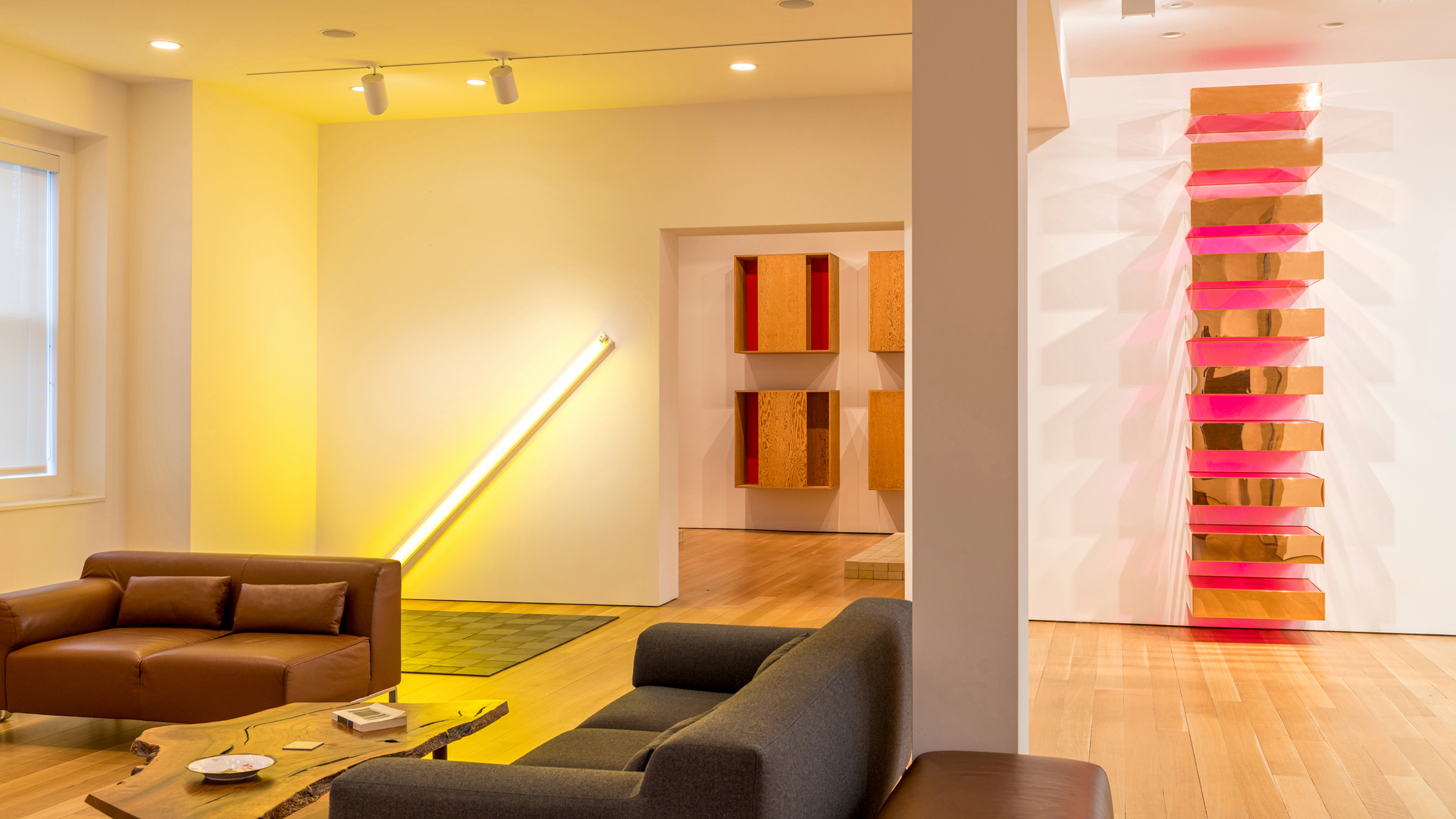 On the top floor, fluorescent light from Flavin’s ascending “monument” for V. Taitlin, 1964, blends with natural light from a skylight. The seating area features Ron Arad chairs and artwork by Donald Judd, Carl Andre and Richard Tuttle. All works offered in Defined Space: The Collection of Henry S. McNeil, Jr. on 20 May 2026, and Design in June at Christie’s in New York. Photo: Max Touhey