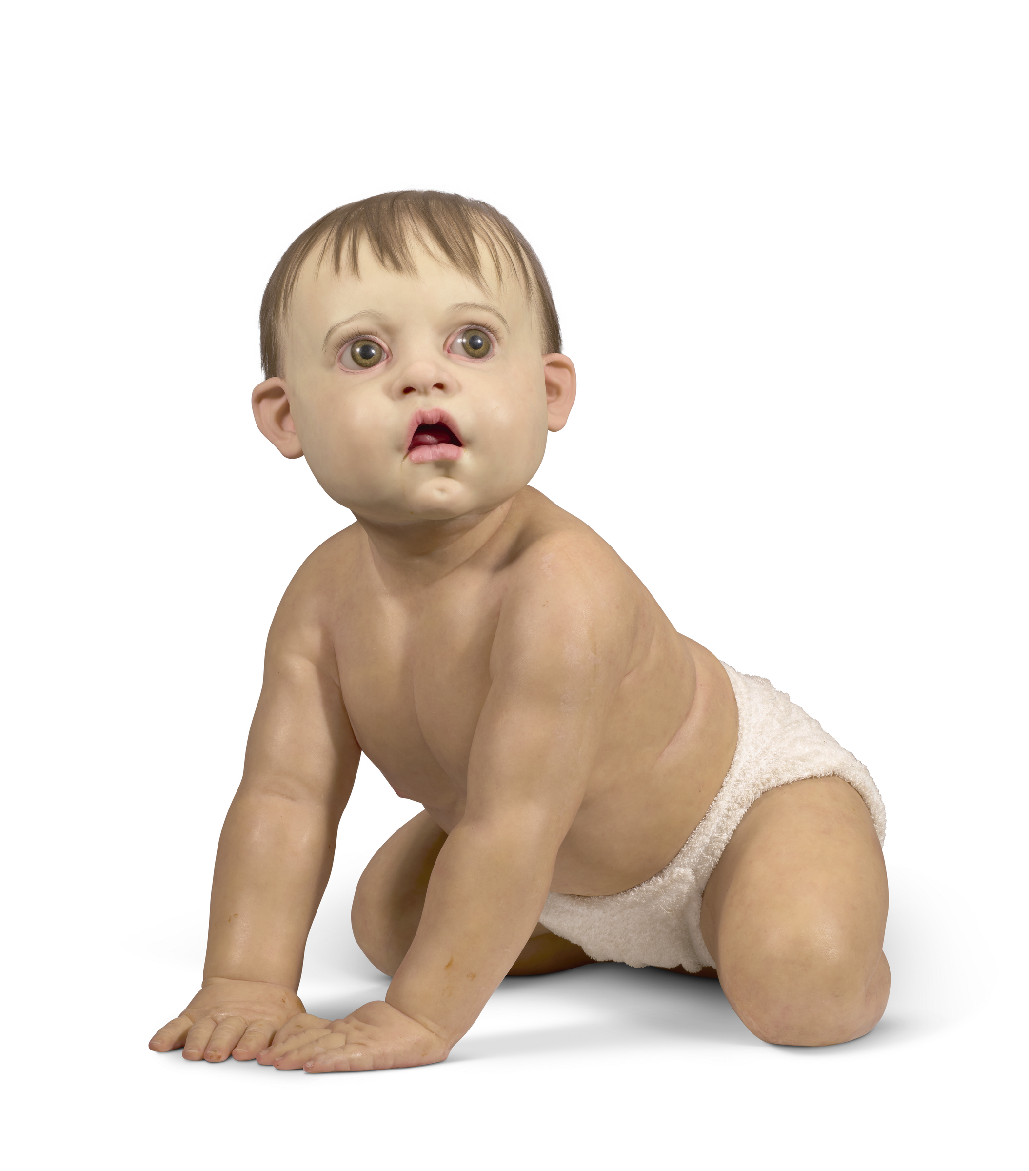 Ron Mueck (b. 1958), Big Baby 3, 1996-1997. Resin, fiberglass, terrycloth and hair. 33 x 26 x 32½ in (83.8 x 66 x 82.5 cm). Estimate: $700,000-1,000,000. Offered in 21st Century Evening Sale Featuring Works from the Edlis | Neeson Collection on 19 November 2025 at Christie’s in New York