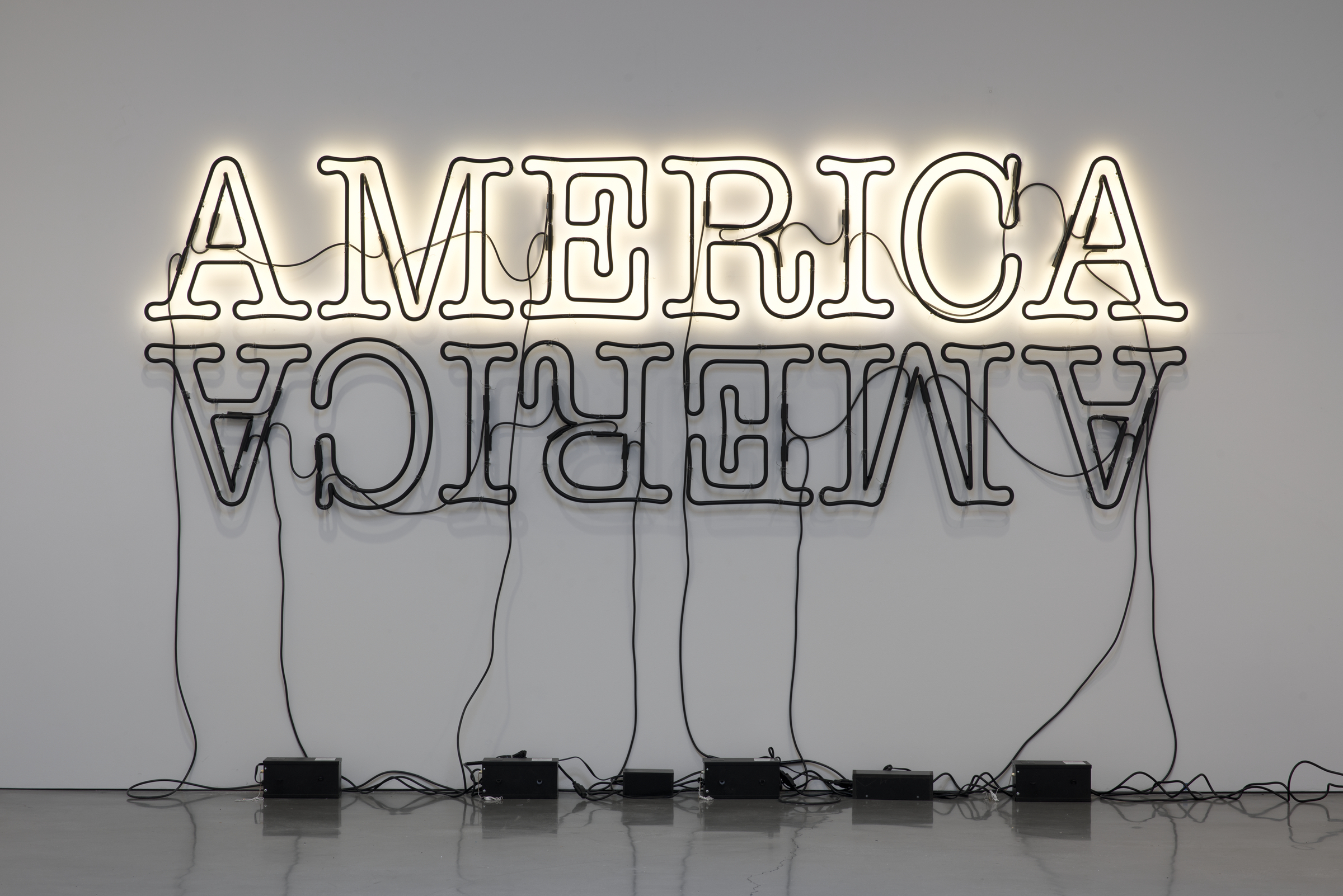 Glenn Ligon (b. 1960), Double America 2, 2014. Neon and paint. 48 x 145 x 3 in (121.9 x 368.3 x 7.6 cm). Estimate: $2,500,000-3,500,000. Offered in 21st Century Evening Sale Featuring Works from the Edlis | Neeson Collection on 19 November 2025 at Christie’s in New York