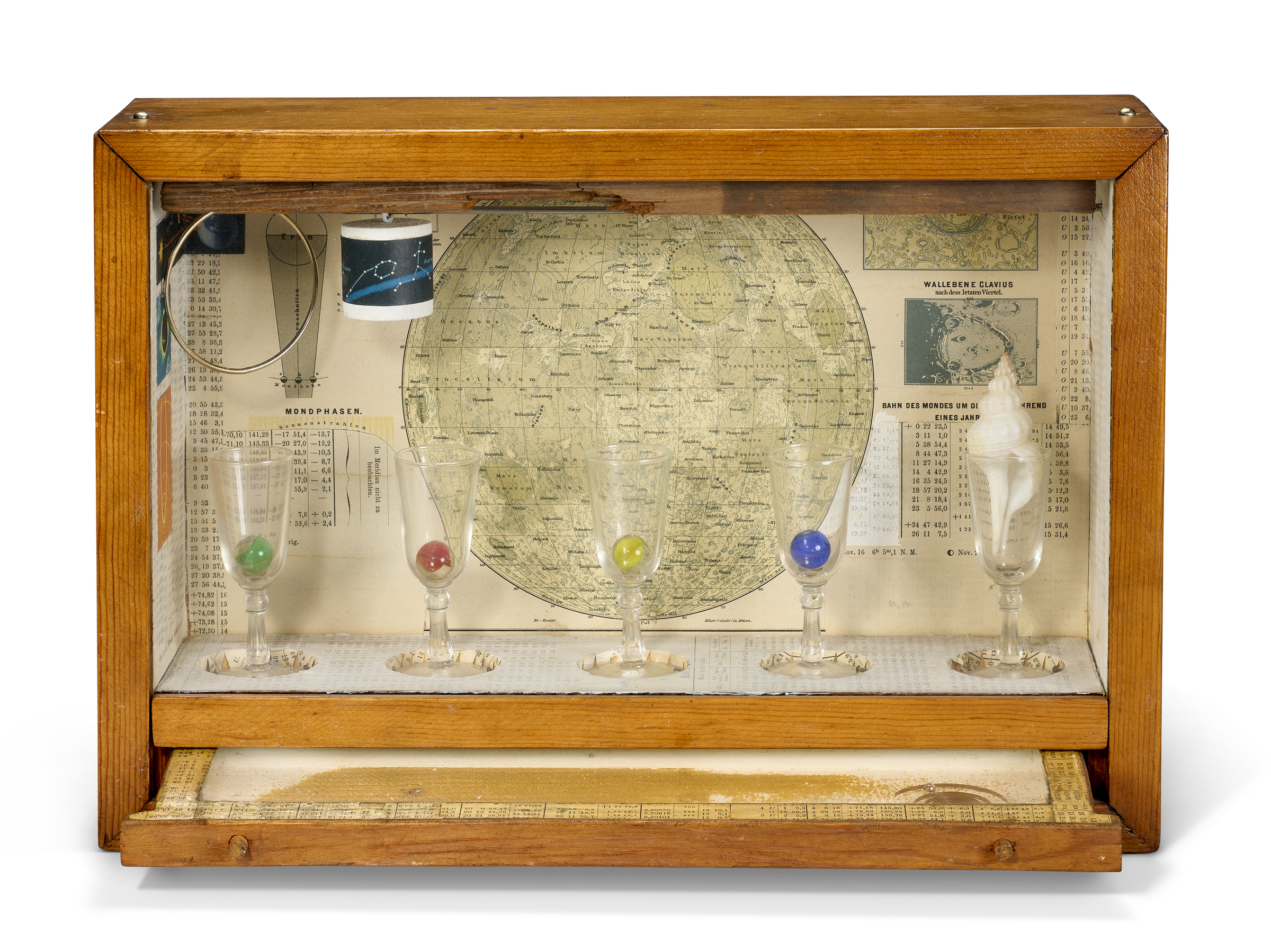 Joseph Cornell (1903-1972), Untitled (Celestial Navigation), c. 1950. Wood box construction — wood, glass, gouache, printed paper collage, metal, sand and seashell. 11⅛ x 16 x 4¼ in (28.6 x 41.3 x 10.2 cm). Estimate: $300,000-500,000. Offered in Post-War and Contemporary Day Sale on 20 November 2025 at Christie’s in New York