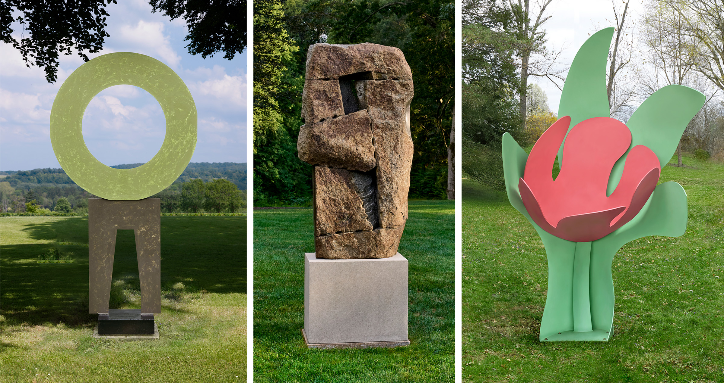 Left to right: David Smith (1906-1965), Circle 2 Legs, 1963. Steel and paint. 107½ x 60 in (273.1 x 152.4 cm). Estimate: $2,000,000-3,000,000. Offered in The Collection of Robert F. and Patricia G. Ross Weis on 17 November 2025 at Christie’s in New York; Isamu Noguchi (1904-1988), Myo, 1957-1966. Kurama granite. 65 x 35 x 15 ½ in. (165.1 x 88.9 x 39.4 cm. Estimate: $2,000,000-3,000,000. Offered in 20th Century Evening Sale on 17 November 2025 at Christie’s in New York; Tom Wesselmann (1931-2004), Standing Tulip, 1992. Enamel on aluminum. 146 x 91 x 87 in (370.8 x 231.1 x 221 cm). Estimate: $500,000-700,000. Offered in The Collection of Robert F. and Patricia G. Ross Weis on 17 November 2025 at Christie’s in New York