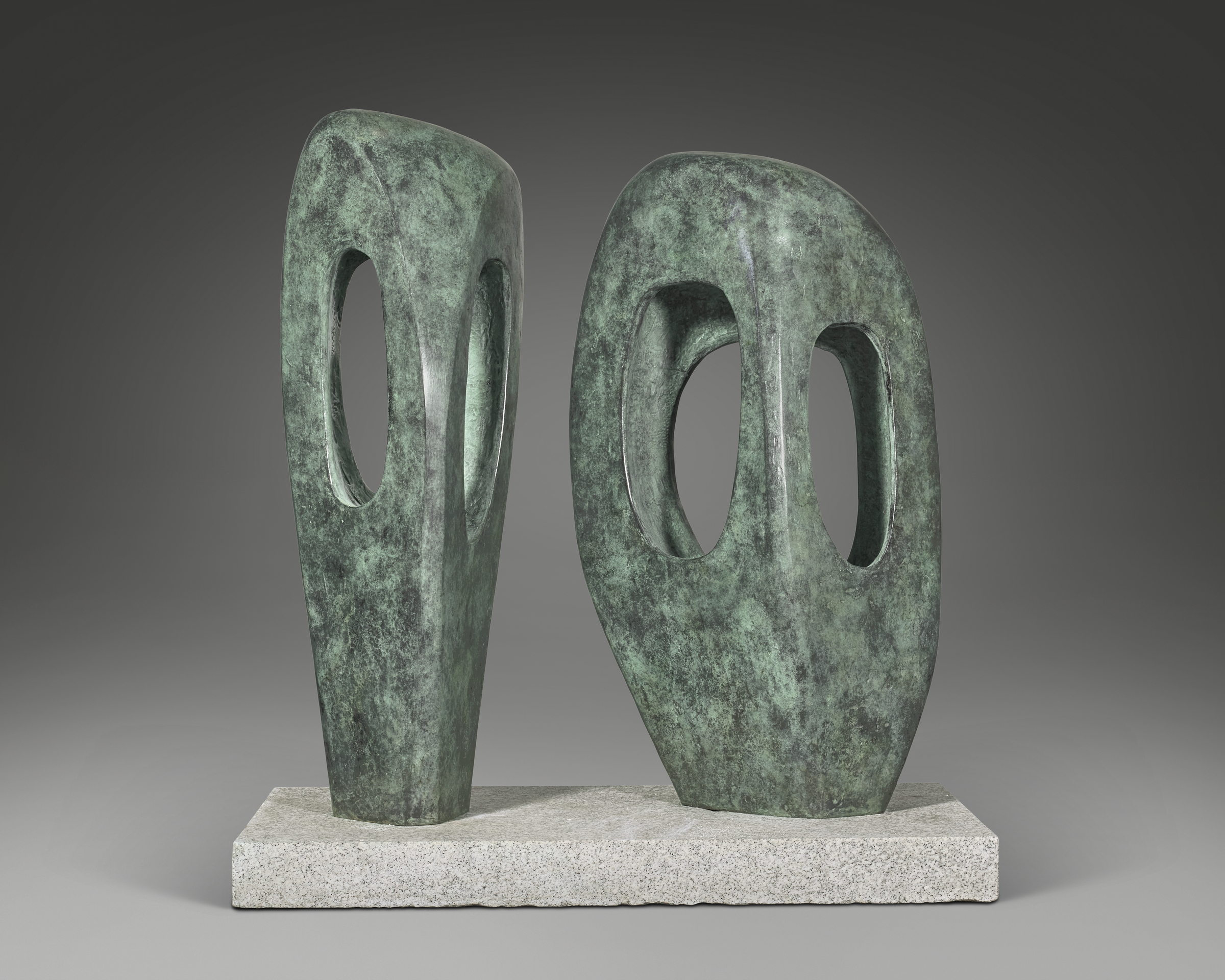 Barbara Hepworth (1903-1975), Two Forms in Echelon, conceived 1961, cast 1964. Bronze with green patina. Height: 45⅜ in (115.3 cm). Estimate: $2,000,000-3,000,000. Offered in 20th Century Evening Sale on 17 November 2025 at Christie’s in New York