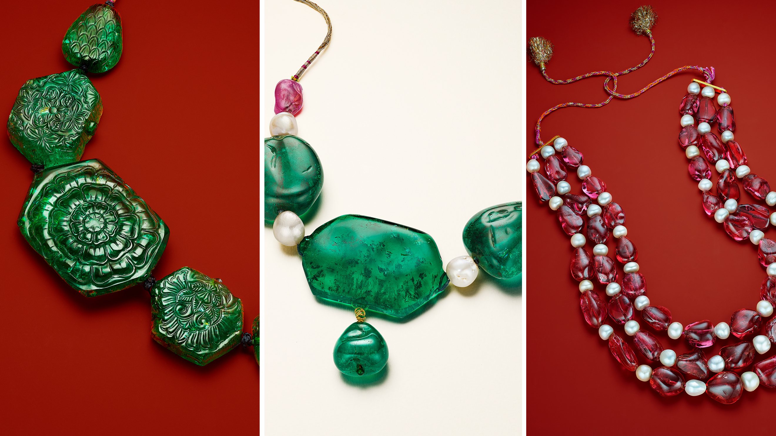 From left to right: A Mughal carved emerald necklace. With three carved hexagonal and two carved pear-shaped emeralds of approximately 470.00, 294.00, 199.50, 108.50 and 106.50 carats, c. 1750. Sold for $6,221,000 A Mughal multi-gem and emerald necklace. Centring upon a hexagonal and drop-shaped emerald of approximately 297.00 carats total, two baroque-shaped emeralds, baroque drop-shaped spinel bead, baroque ruby bead, baroque natural pearls of 14.20 to 11.60 mm, c. 1750. Sold for $5,555,500. Mughal three-strand spinel and natural pearl necklace. With forty-five polished spinel beads, forty-eight round and near-round natural pearls ranging from approximately 13.20 mm to 9.90 mm, c. 1750. Sold for $3,014,500. All from Magnificent Mughal Jewels: Property from a Royal Collection, offered in Magnificent Jewels on 17 June 2025 at Christie’s in New York