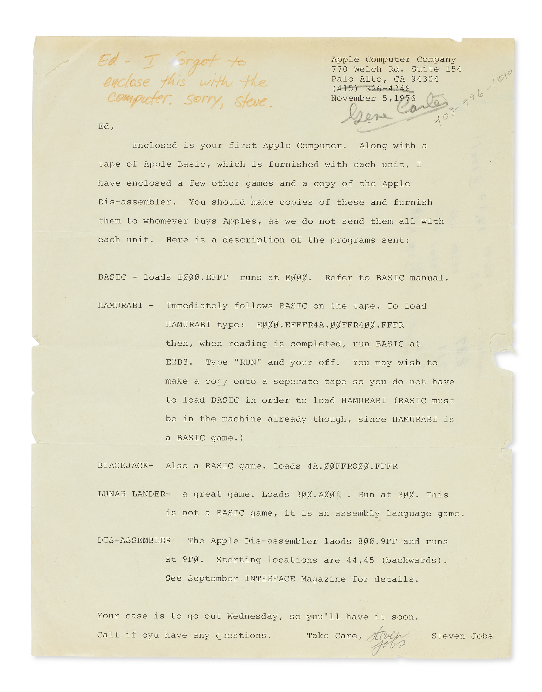 Steve Jobs, Two typed letters, the first with autograph manuscript note and signed twice, 5 November 1976. Estimate: $50,000–80,000. Offered in Pushing Boundaries: Ingenuity from the Paul G. Allen Collection on 10 September 2024 at Christie’s in New York