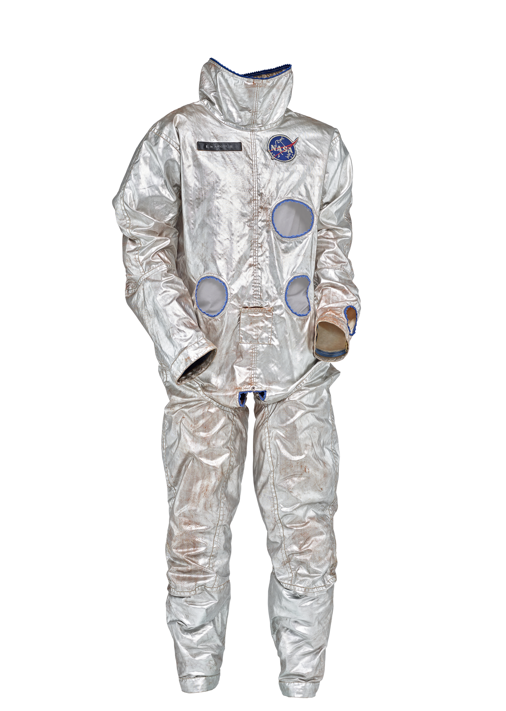 ‘This suit was made for Ed White during Gemini 4 training, and he also wore it for his official NASA portrait. Made of aluminized nylon, it covered an inner pressure suit and formed the visible outer layer of the total spacesuit. What is particularly great about this cover-layer is that it is from the first generation of spacesuits that were designed to be worn outside of the shuttle. It is this amazing, transitional object from when scientists were in the thick of figuring out micrometeoroid protection, temperature resistance and bulk. White’s name is on the label and the NASA logo patch is on the front. There are very few spacesuits available to own — nearly all others are in the Smithsonian — and the fact that this suit was developed for a pioneer like White makes it all the more remarkable.’