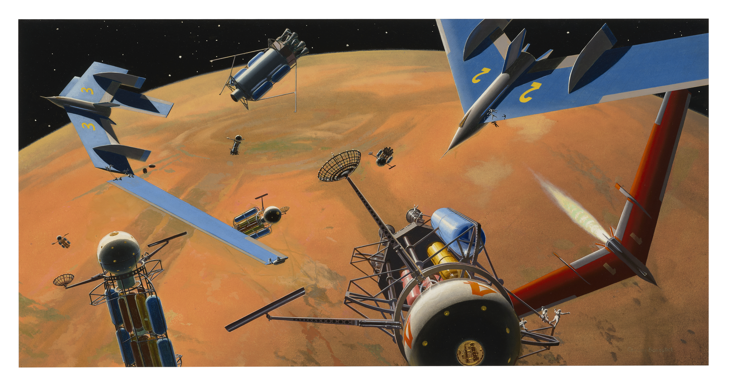 Chesley Bonestell (1888-1986), In orbit 600 miles above Mars! Preparing to land, c. 1953. Oil on board. 17¼ x 33¼ in (43.8 x 84.5 cm). Estimate: $20,000–30,000. Offered in Over the Horizon: Art of the Future from the Paul G. Allen Collection from 23 August–12 September at Christie’s Online