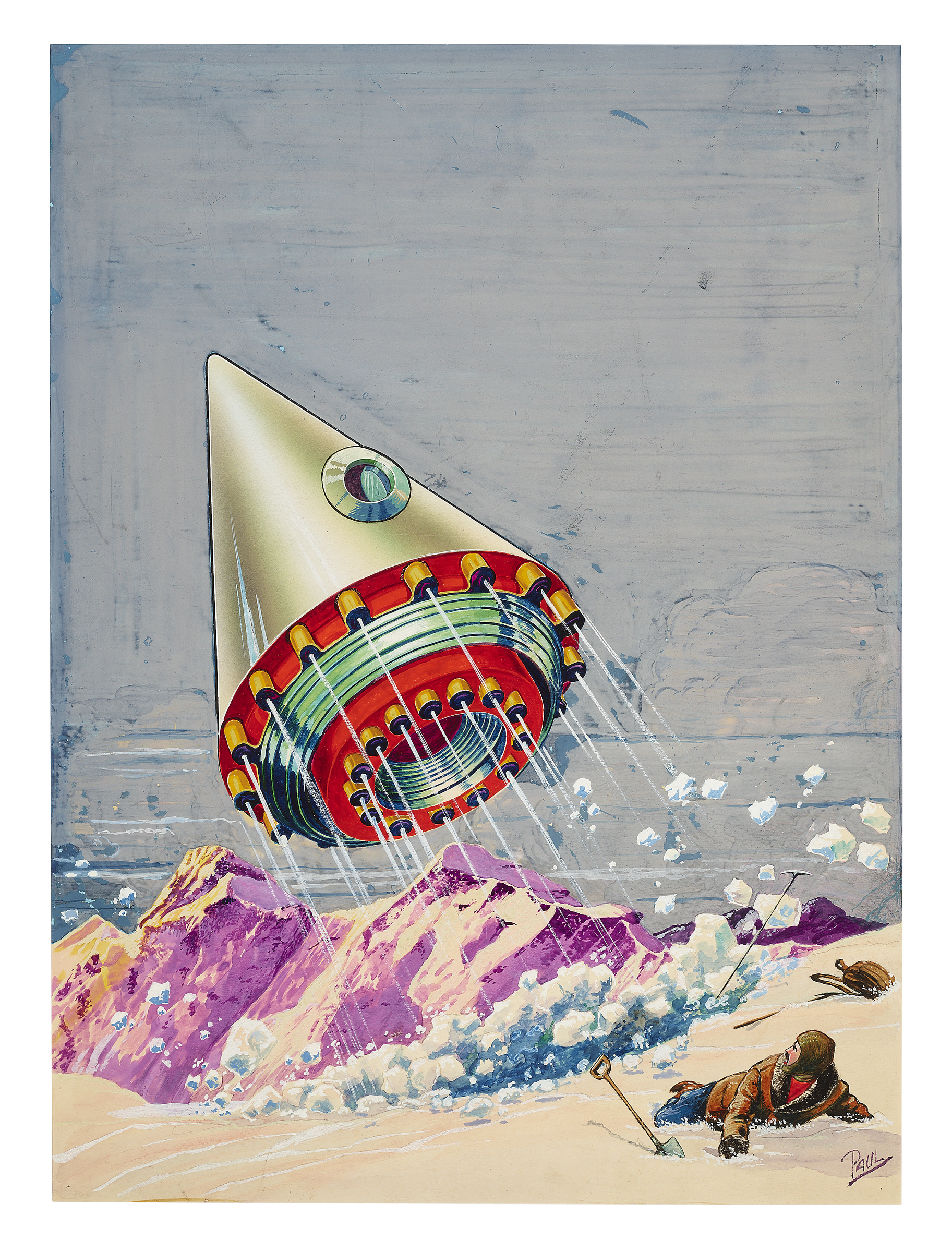Frank R. Paul (1884-1963), Take-off from Mt. Everest, c. 1934. Gouache and colours on paper. 22 x 16 in (55.9 x 40.6 cm). Estimate: $12,000–18,000. Offered in Over the Horizon: Art of the Future from the Paul G. Allen Collection from 23 August–12 September at Christie’s Online