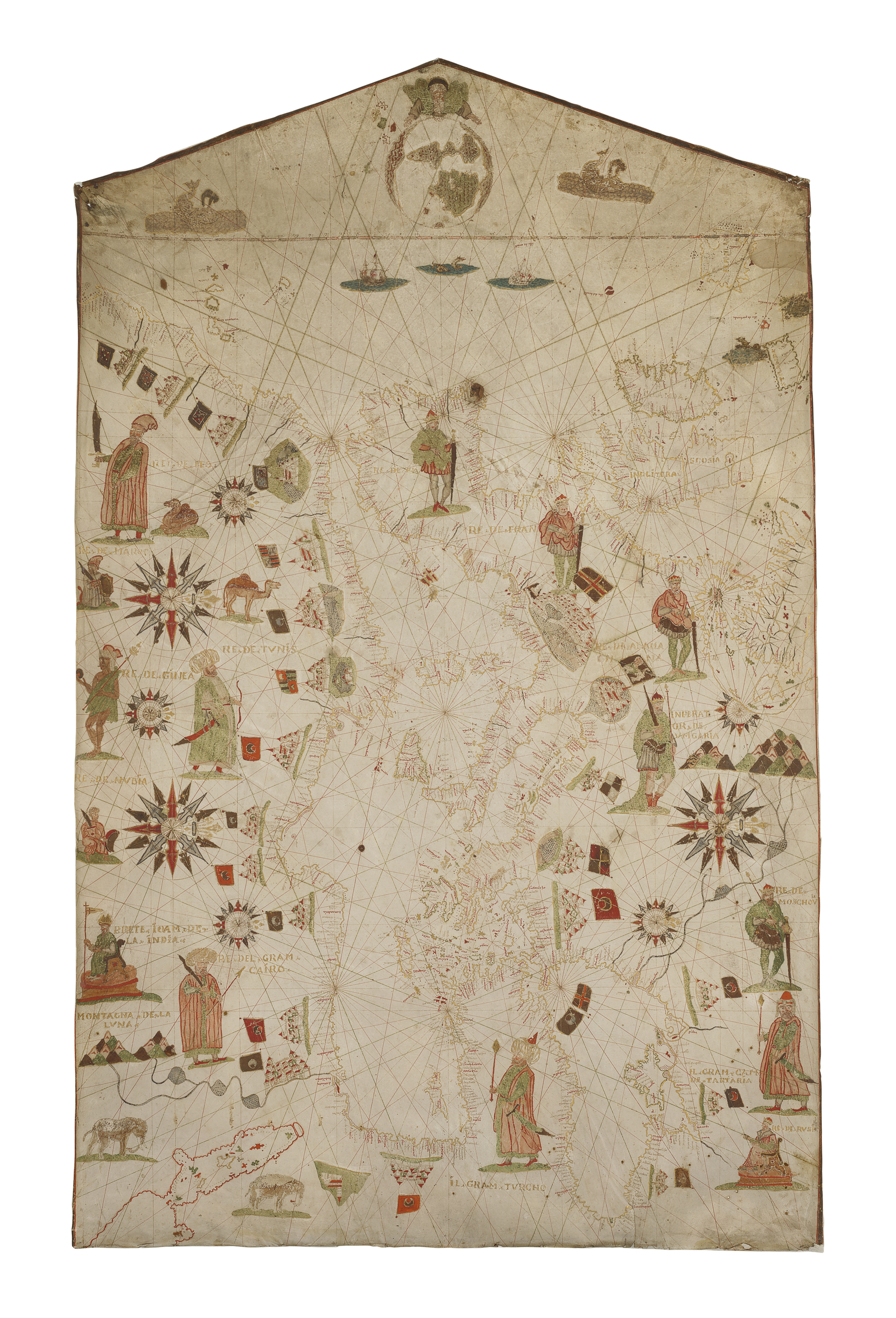 ‘This particular chart is extremely “luxurious”, with numerous decorative figures, townscapes and compass roses. Jacopo Scotti, enterprising maker of this map, saw the blank inland areas as an opportunity to decorate the chart for a land-based market interested in seeking ornamental status symbols.